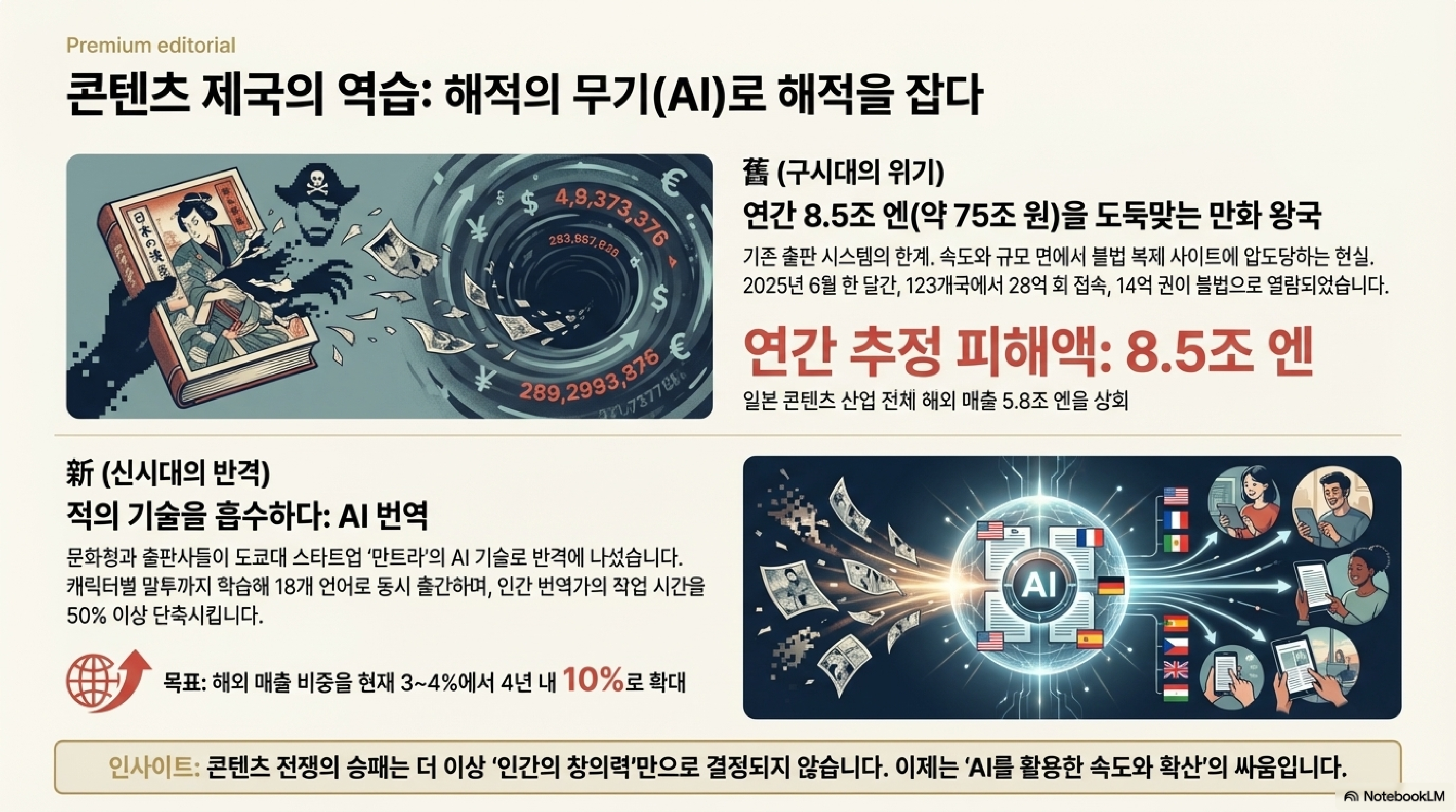 먼저 밝은 면부터 보죠. 일본 문화 산업의 구원투수로 AI가 등판했습니다. 일본 만화는 해외에서 인기가 높지만, 불법 해적판 사이트로 인한 연간 피해액이 무려 8.5조 엔, 우리 돈으로 약 76조 원에 달합니다. 정식 번역본이 나오는 속도가 해적판을 따라가지 못하기 때문이죠.