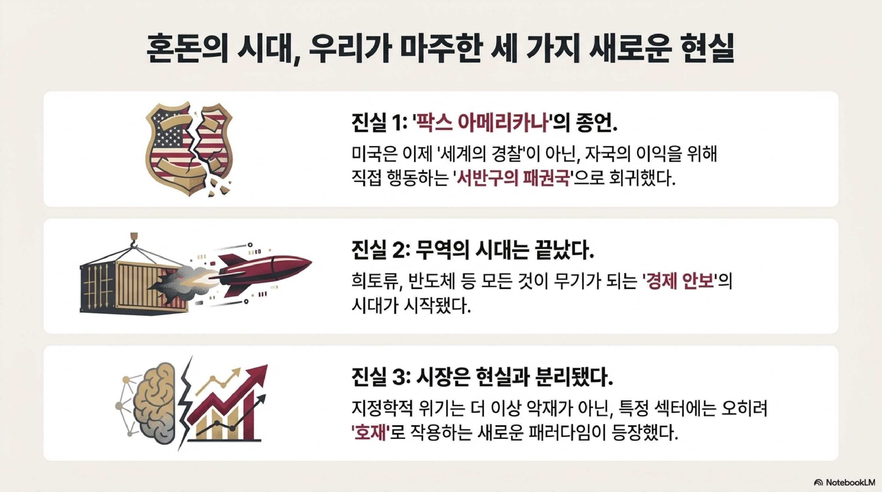오늘 우리는 21세기 권력 투쟁이 벌어지는 세 개의 경기장을 모두 둘러봤습니다. 군사력을 동원한 지정학적 하드파워, 자원을 무기로 한 경제적 압박, 그리고 미래 패권을 결정할 기술 경쟁까지.