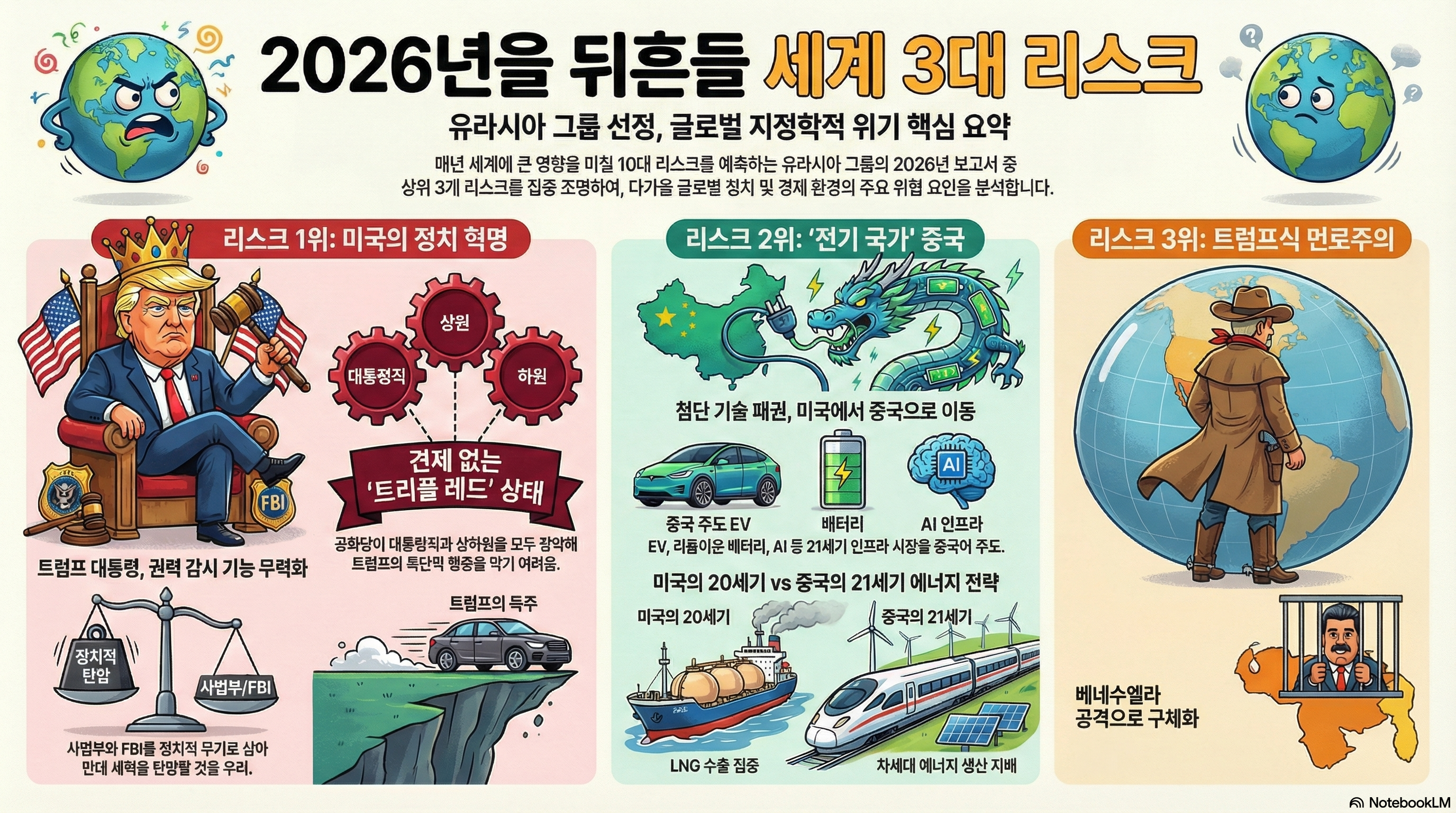 이 사건은 단순히 베네수엘라만의 문제가 아닙니다. 국제정세 분석기관 유라시아 그룹은 2026년 세계 1위 리스크로 트럼프 대통령 하의 "미국의 정치 혁명"을 꼽았습니다. 그 이유는 트럼프 대통령이 사법부나 FBI 같은 권력 감시 기구를 무력화시켜 백악관의 '정치적 무기'로 사용하고 있기 때문입니다.