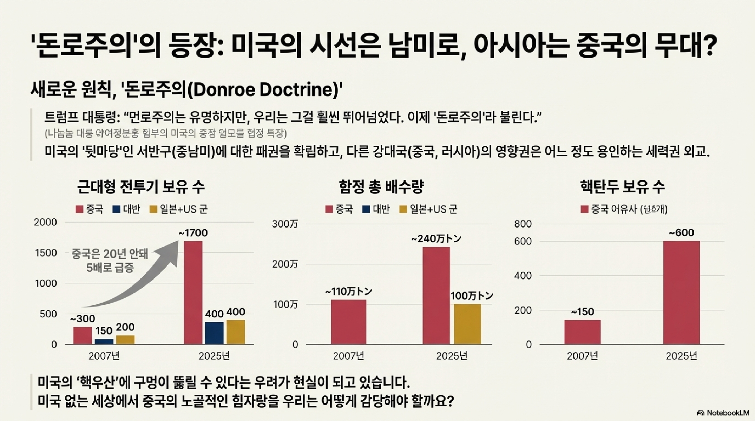 그렇다면 이 모든 것이 우리와 무슨 상관일까요? 미국의 시선이 자국과 '서반구(Western Hemisphere)'로 향하는 동안, 태평양의 군사 균형은 무서운 속도로 무너지고 있습니다.