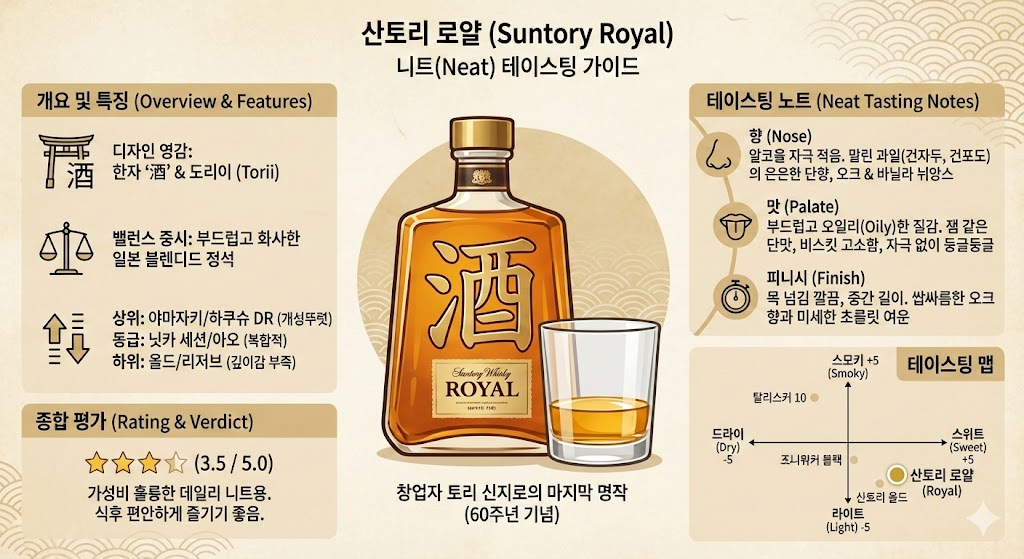 - vs 산토리 올드/리저브: 보유하신 '산토리 올드'가 묵직하고 둥글둥글한 느낌이라면, 로얄은 밸런스가 더 잘 잡혀 있고 섬세합니다. '스페셜 리저브'보다 셰리 향은 덜할 수 있으나, 목 넘김과 전체적인 완성도는 로얄이 한 단계 위로 평가받습니다.