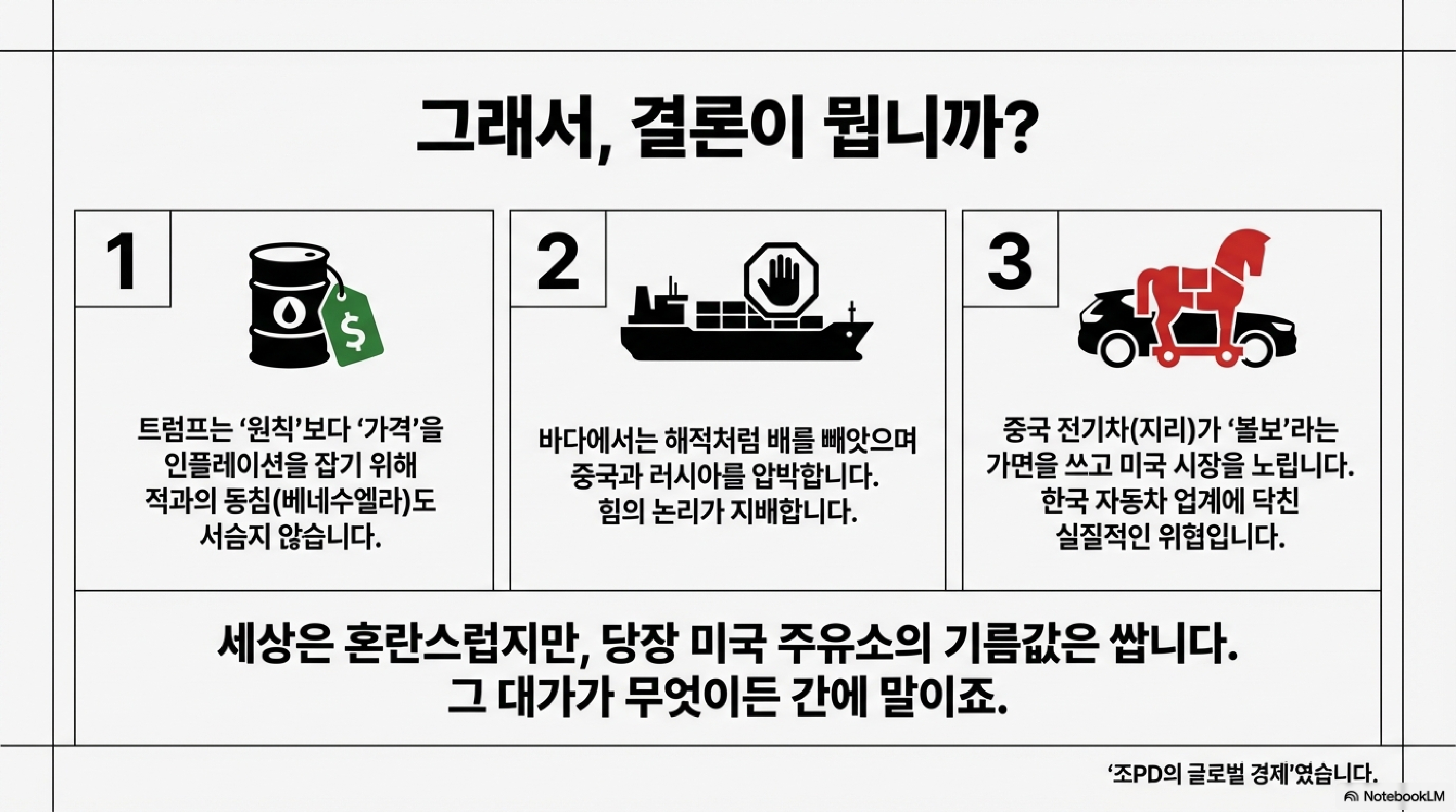 반갑습니다! 세상에서 가장 맛있는 경제 이야기를 배달해 드리는, '조PD의 글로벌 경제'입니다. 2026년 새해가 밝았는데, 시청자들께서 받아보신 새해 선물은 무엇이었나요? 연초부터 주요 외신들을 보니, 글로벌 경제는 우리에게 아주 흥미진진한 선물 보따리를 풀어놓은 것 같습니다. 보아하니 올해는 '전쟁'이라는 단어가 키워드인 모양입니다. 길 위에서는 전기차를 둘러싼 거인들의 싸움이 시작됐고, 시장에서는 한 사람의 말이 곧 법이 되는 강력한 주먹이 등장했으며, 기업들은 마치 포켓몬 진화하듯 서로를 삼켜 거대한 공룡이 되려는 움직임을 보이고 있습니다. 자, 그럼 2026년의 거대한 게임판에서 벌어지는 첫 번째 라운드, 지금부터 함께 관전하시죠!
