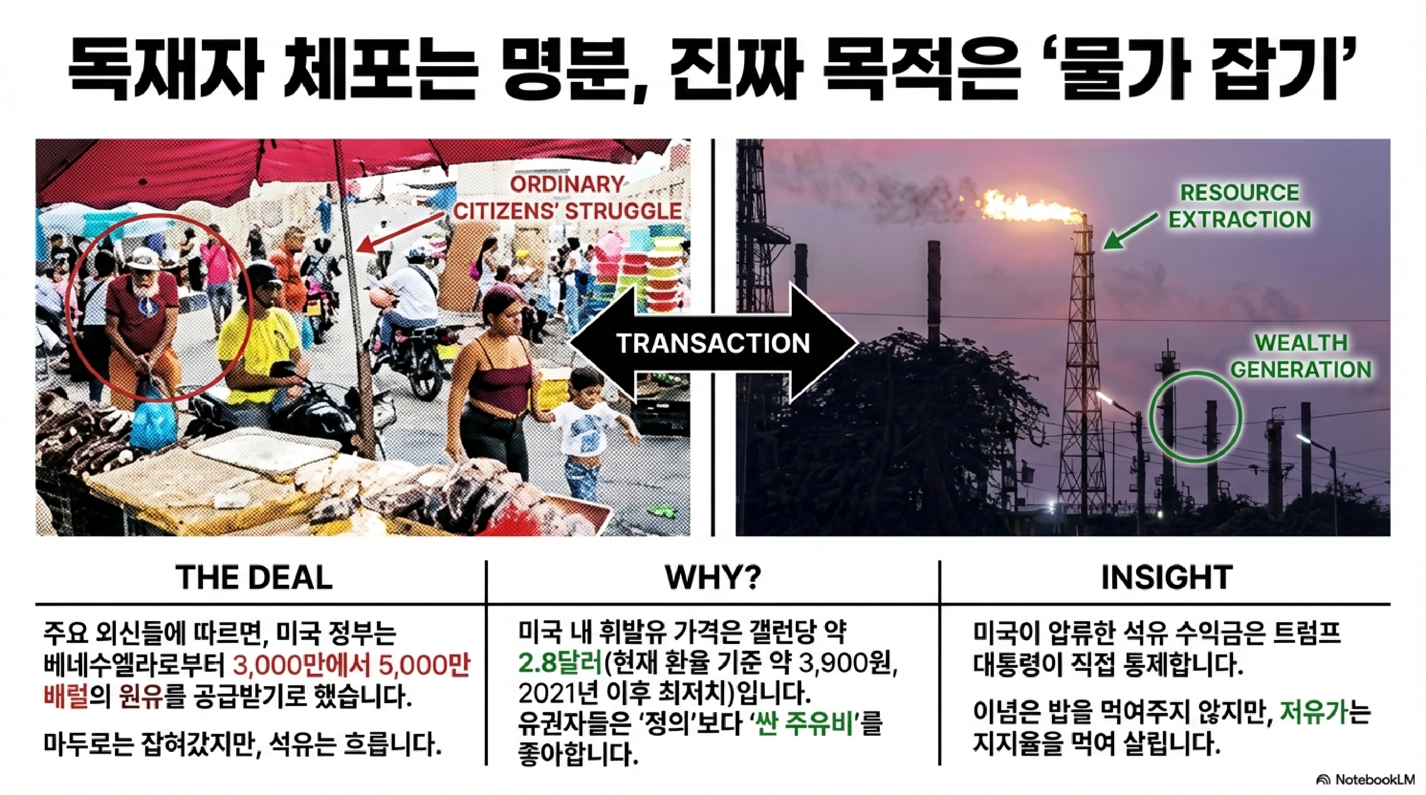 이것은 완벽한 '비대칭적 거래'입니다. 마치 어른이 아이에게 "네 용돈 천 원, 나한테 넘겨. 내가 잘 관리해서 너랑 나를 위해 쓸게"라고 말하는 것과 비슷합니다. 미국은 아주 적은 노력으로 엄청난 지정학적, 경제적 영향력을 행사하는 반면, 베네수엘라는 생존을 위해 그 제안을 받아들일 수밖에 없는 구조인 셈입니다.