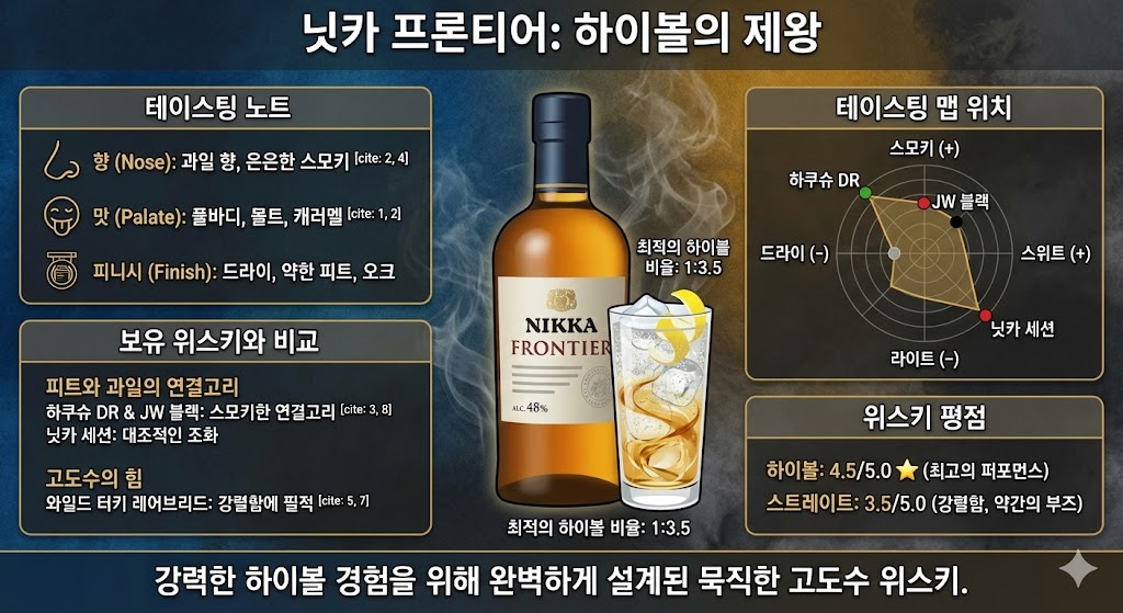 니카 프론티어(Nikka Frontier), 그 이름처럼 위스키의 새로운 '개척지'를 여는 듯한 강렬한 하이볼 경험에 대한 글입니다. 보유하고 계신 위스키 리스트를 참고하여, 니카 프론티어가 어떤 위치에 있는지, 그리고 왜 하이볼 애호가들의 필구 아이템인지 분석해 드립니다.