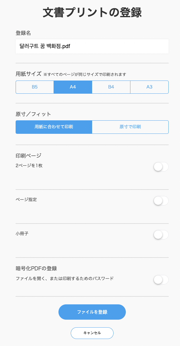 파일을 첨부하면 용지사이즈나 인쇄 페이지 등을 지정할 수 있게 되어있다.