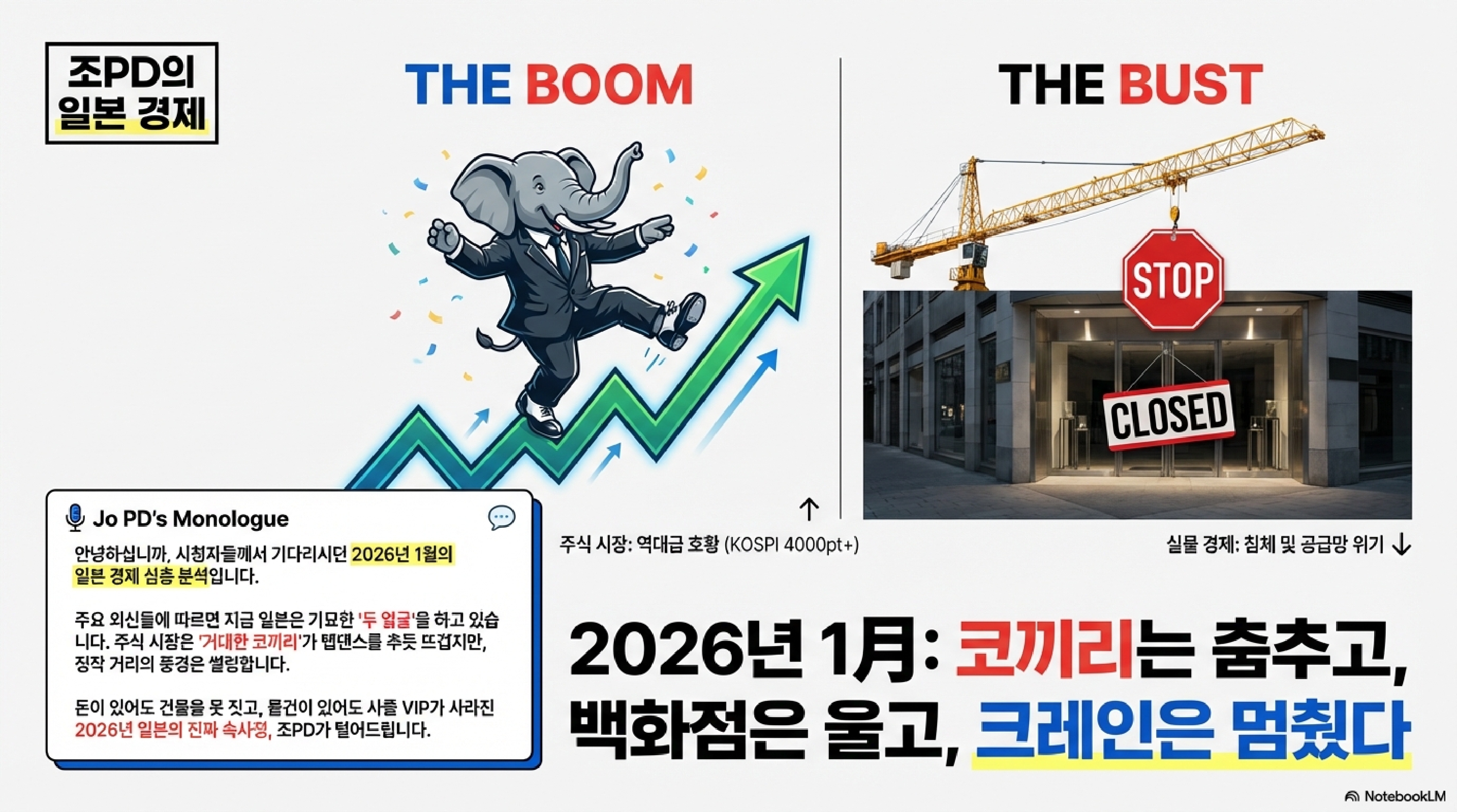 여러분, 요즘 일본이 아주 시끌벅적합니다. 한쪽에서는 집 지을 사람이 없어서 공사판이 멈춰 섰다고 아우성이고, 다른 한쪽 정치판에서는 평생을 으르렁대던 앙숙들이 갑자기 손을 맞잡고 "우리 오늘부터 1일!"을 외치고 있습니다. 그리고 우리 어머니들의 쇼핑 성지였던 백화점은 이제 역사의 뒤안길로 사라지고 있다고 합니다.