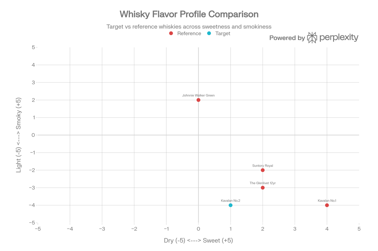 완벽한 대척점입니다. 탈리스커의 스모키하고 짭짤한 바다 내음과 정반대로, 카발란 No.2는 피트가 전혀 없는(Unpeated) 화사함 그 자체입니다. 피트 위스키를 마신 후 입가심용으로 마시면 극적인 반전을 즐길 수 있습니다.