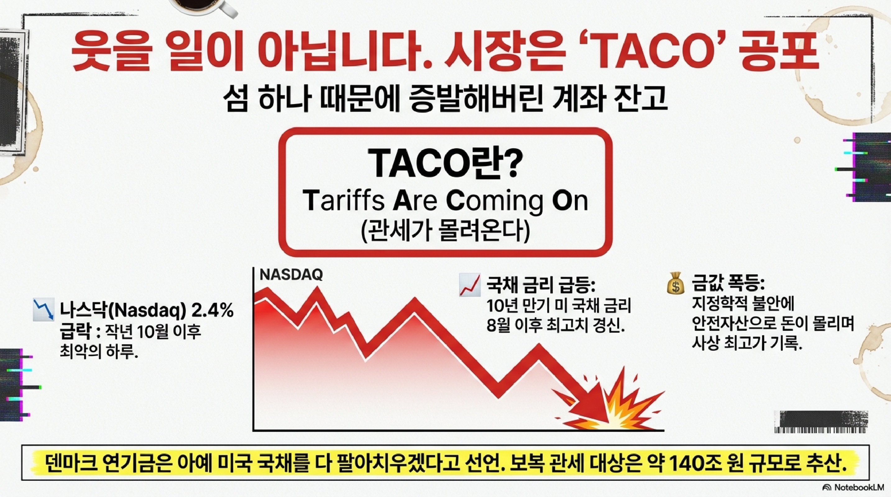 시장에선 두 가지 용어가 다시 등장했습니다. 하나는 'Sell America trade', 즉 투자자들이 "더 이상은 못 참겠다"며 '미국 주식 손절'에 나설지도 모른다는 공포입니다. 다른 하나는 'TACO trade'입니다. "Trump Always Chickens Out (트럼프는 결국 꼬리를 내린다)"의 약자로, 그동안 시장이 학습해 온 관성이죠. 분석가들은 이번 사태가 단순한 엄포(TACO)로 끝날지, 아니면 실질적인 미국 자산 투매로 이어질지 촉각을 곤두세우고 있습니다.