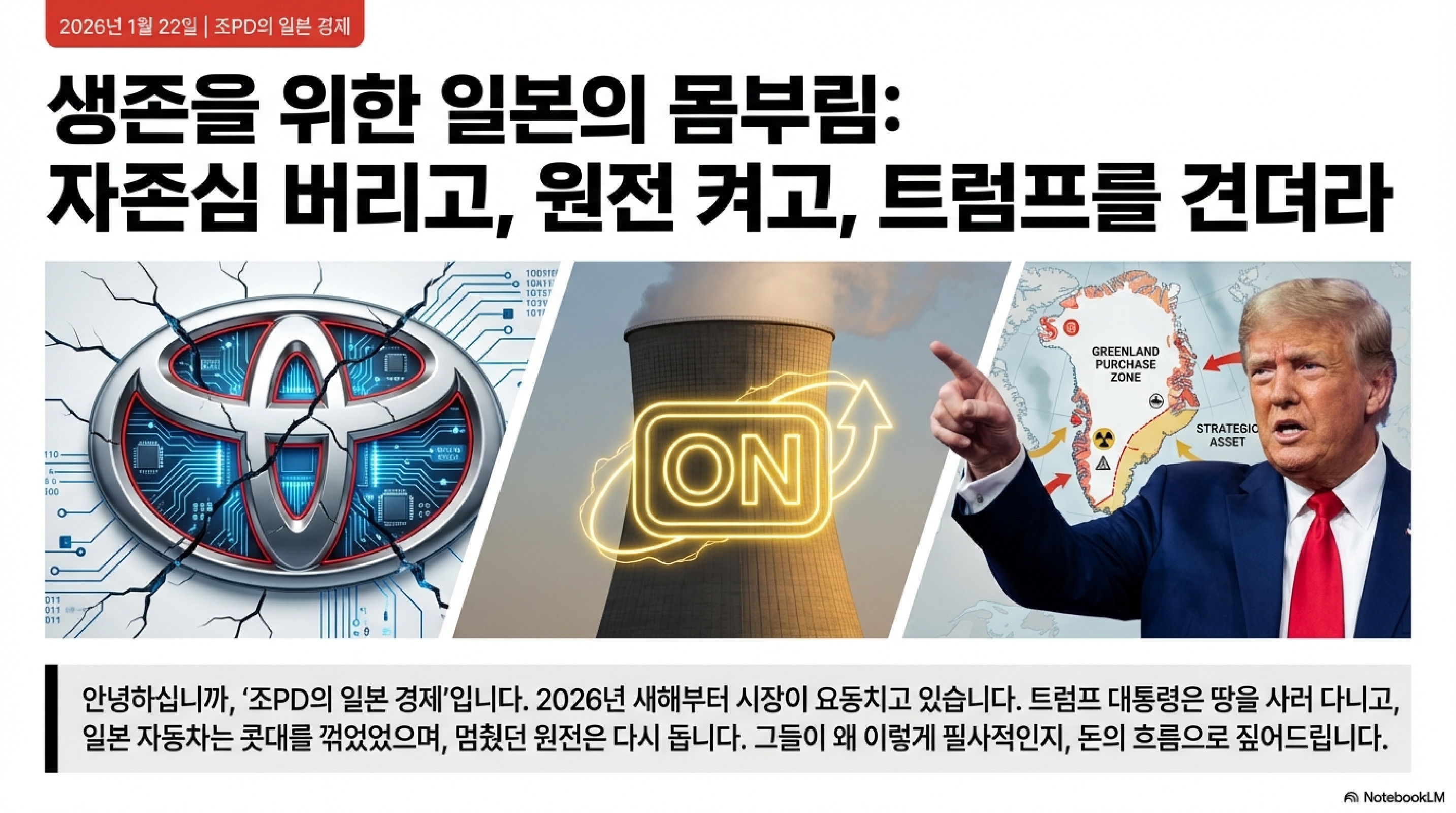 '조PD의 일본 경제'입니다. 온갖 이해관계가 뒤엉키고, 어제의 적이 오늘의 동지가 되며, 상식은 멀리 안드로메다로 날아가는 혼돈의 시대에 오신 것을 환영합니다. 오늘 우리는 낡고 익숙했던 확실성들이 어떻게 종말을 고하는지 보여주는 세 가지 장면을 목격하게 될 겁니다. 오늘 우리가 함께 씹고 뜯고 맛볼 메뉴는 이렇습니다. 첫째, 기업 간의 영원한 경쟁이라는 신화가 깨지는 현장, 일본 자동차 업계의 '반도체 어벤져스' 결성 소식. 둘째, 강대국 간의 굳건한 동맹이라는 믿음이 흔들리는 순간, 다보스 포럼을 부동산 쇼핑몰로 만든 트럼프 전 대통령의 '그린란드 인수' 소동. 그리고 마지막으로, 최소한의 재정적 책임감이라는 약속이 선거 앞에서 휴지 조각이 되는 현실, 일본 정치권의 '소비세 제로' 파티까지.
