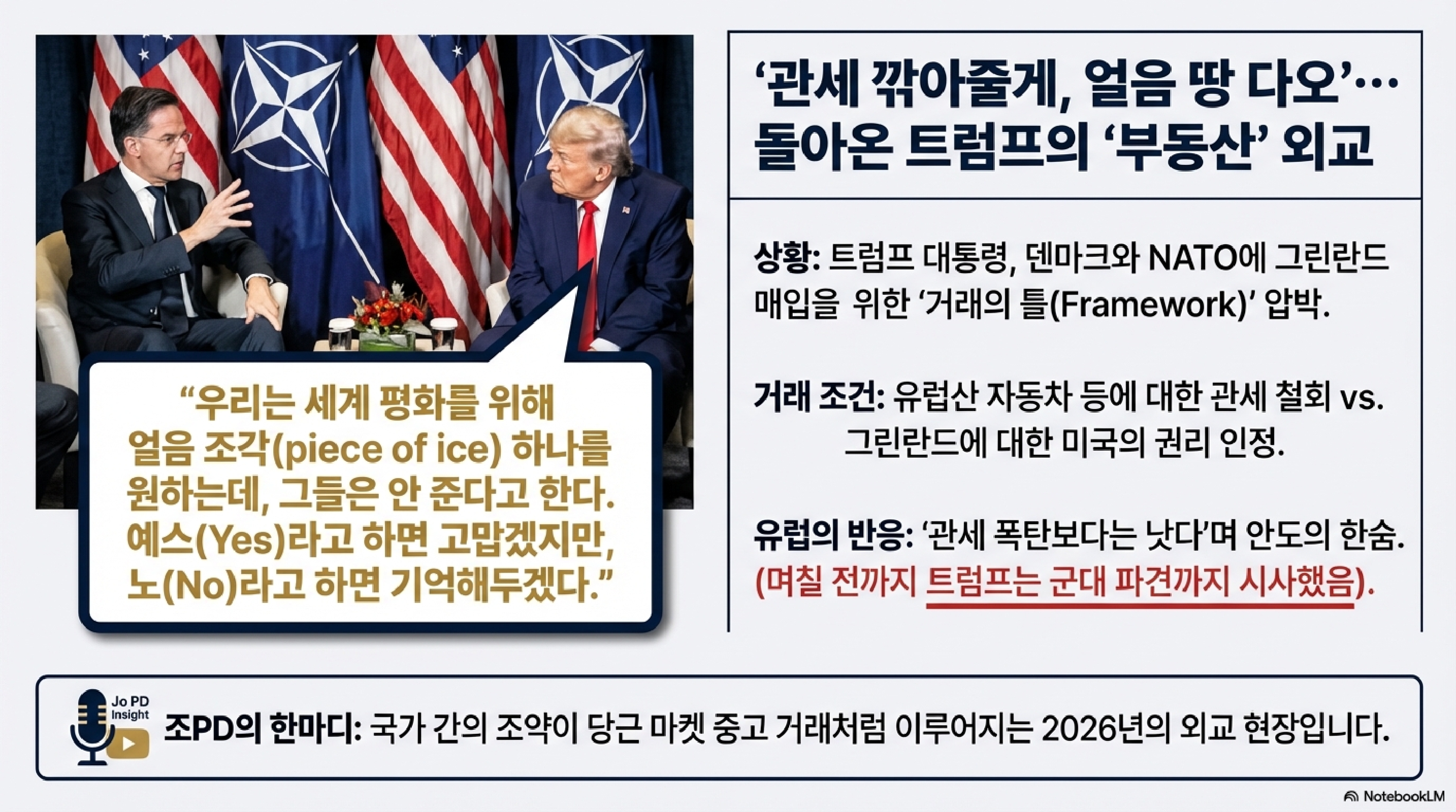 첫 번째 이야기는 도널드 트럼프 미국 대통령이 북극의 거대한 섬, 그린란드를 놓고 벌인 아찔한 밀당 외교전입니다. 갖고 싶은 장난감을 사달라고 백화점 바닥에 드러눕는 아이처럼 극단적인 전술을 쓰다가, 결국엔 전혀 다른 장난감을 손에 쥐고 흡족해하는 그의 기묘한 협상 전략을 통해 전후 대서양 동맹의 균열을 들여다봅니다.