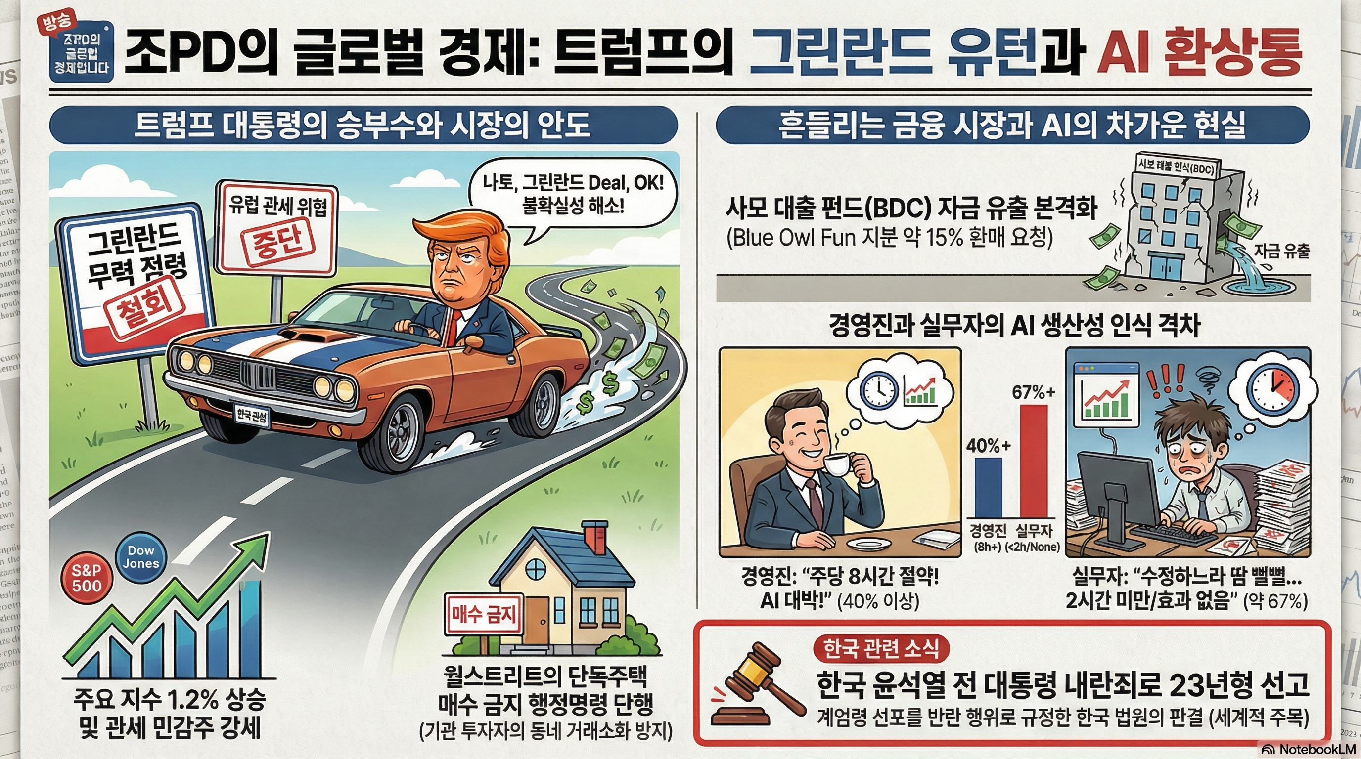 오늘 우리는 낡은 질서가 무너지는 세 가지 전선을 목격했습니다. 지정학의 판을 흔드는 트럼프의 예측불허 게임, 제조업의 심장을 겨누는 중국의 거대한 공습, 그리고 금융의 성벽에 균열을 내는 새로운 불안의 신호까지.