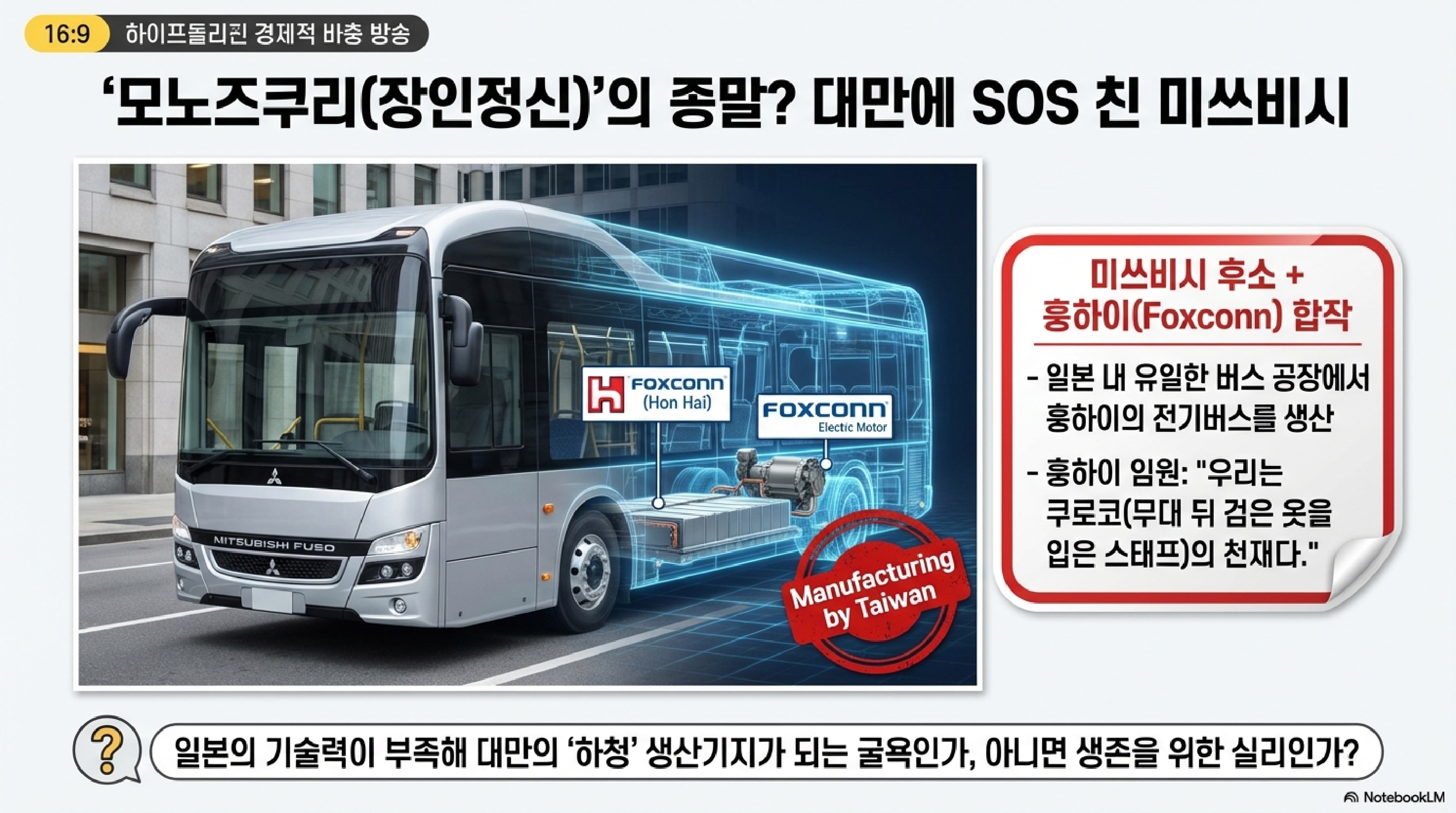 이 거래가 갖는 진짜 의미는 훨씬 큽니다. 현재 일본의 전기 버스 시장 점유율은 전체 버스의 0.4%에 불과한 미미한 수준이고, 그마저도 대부분 중국의 BYD가 차지하고 있습니다. 그런데 더 놀라운 사실은 시청자들께서 아십니까? 일본 내 전기버스 점유율 2위 업체인 EV 모터스 재팬 역시 중국 업체에 생산을 위탁하고 있습니다. 사실상 시장 전체가 중국산인 셈이죠. 이번 합작은 '대만-일본 연합군'이 중국의 독주를 막기 위해 결성된 것이나 다름없습니다. 비유하자면, 수십 년 전통의 동네 초밥 장인이 길 건너에 생긴 거대 훠궈 체인점에 손님을 다 뺏기자, 대만에서 온 슈퍼스타 버블티 프랜차이즈와 손잡고 아무도 상상 못한 '초밥-버블티 세트'를 내놓은 격입니다.