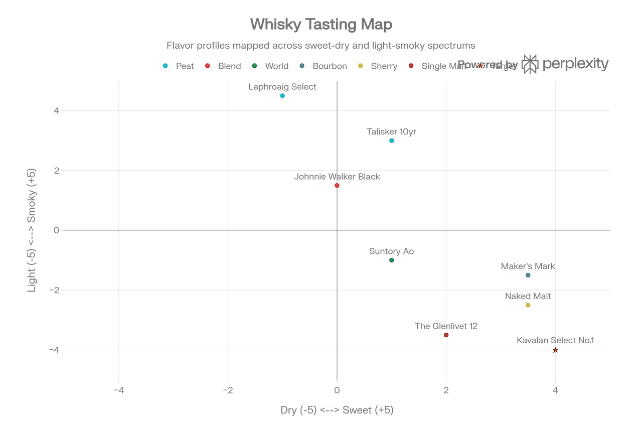 보유하신 위스키 리스트와 배경지식을 바탕으로 카발란 No.1의 위치를 시각화해 보았습니다.