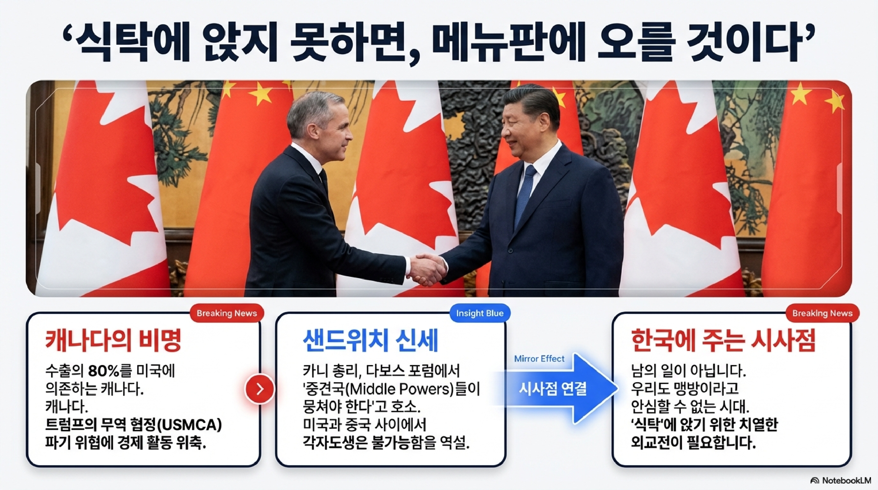 카니 총리의 이러한 행보는 우리에게도 시사하는 바가 큽니다. 한국 역시 미국과 중국이라는 두 강대국 사이에서 복잡한 외교적 줄타기를 해야 하는 '중견국'이기 때문입니다. 캐나다의 이 아슬아슬한 외줄타기는 우리에게 날카로운 질문을 던집니다. 과연 우리는 캐나다처럼 저렇게 배짱 좋게 우리 목소리를 낼 준비가 되어 있을까요? 아니면 메뉴에 오를 운명을 받아들여야 할까요?