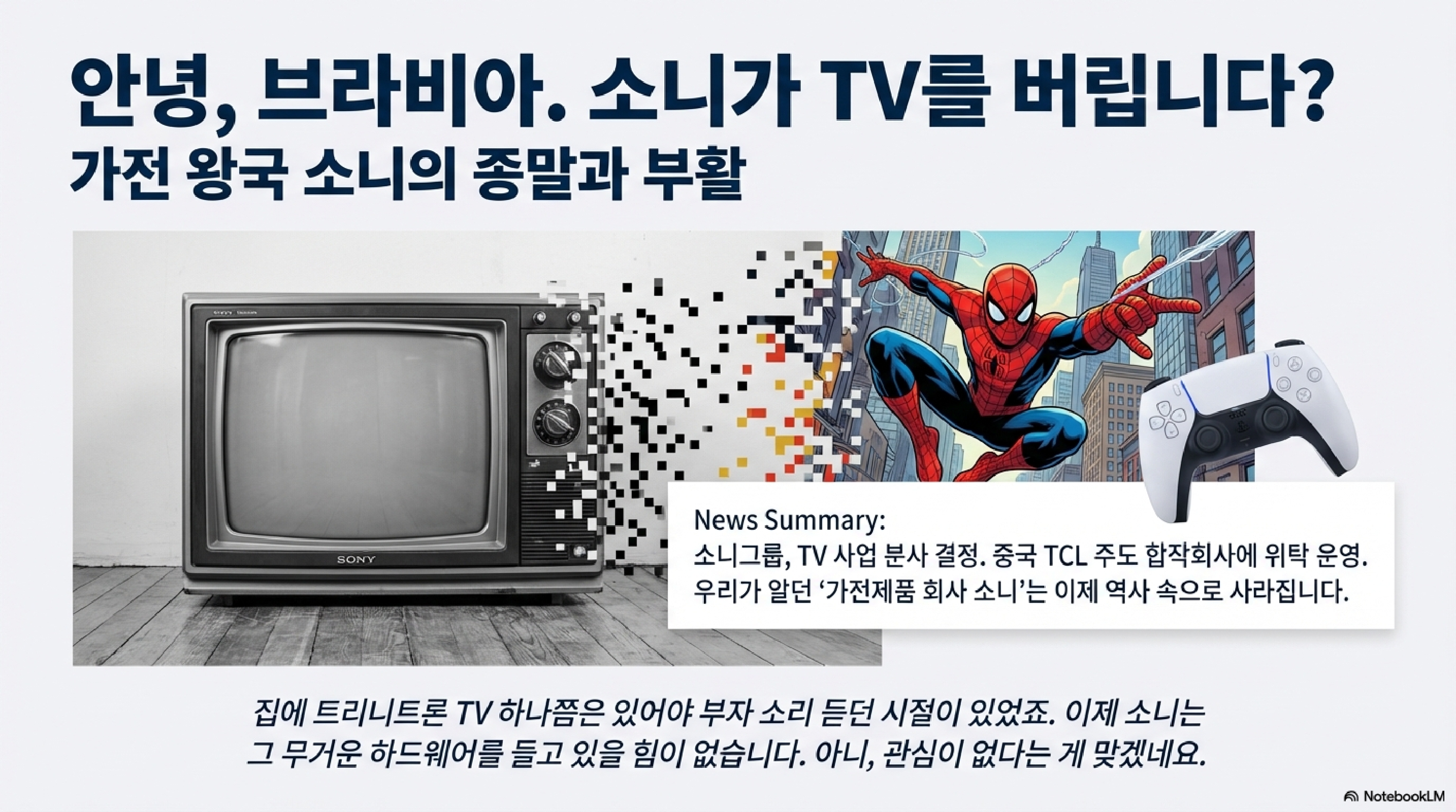 자, 첫 번째 이야기, 바로 소니입니다. 소니가 TV 사업부를 분리해서 중국의 TCL 그룹이 주도하는 합작 회사에 넘기기로 했습니다. "아니, 소니에서 TV를 빼면 뭐가 남냐?" 하시는 분들, 많으실 겁니다. 맞습니다. 이건 단순히 실적이 좀 부진한 부서를 정리하는 차원의 얘기가 아닙니다. 한 시대의 아이콘이었던 기업이 스스로 자신의 심장과도 같았던 정체성을 도려내는, 그야말로 엄청난 도박인 셈이죠.