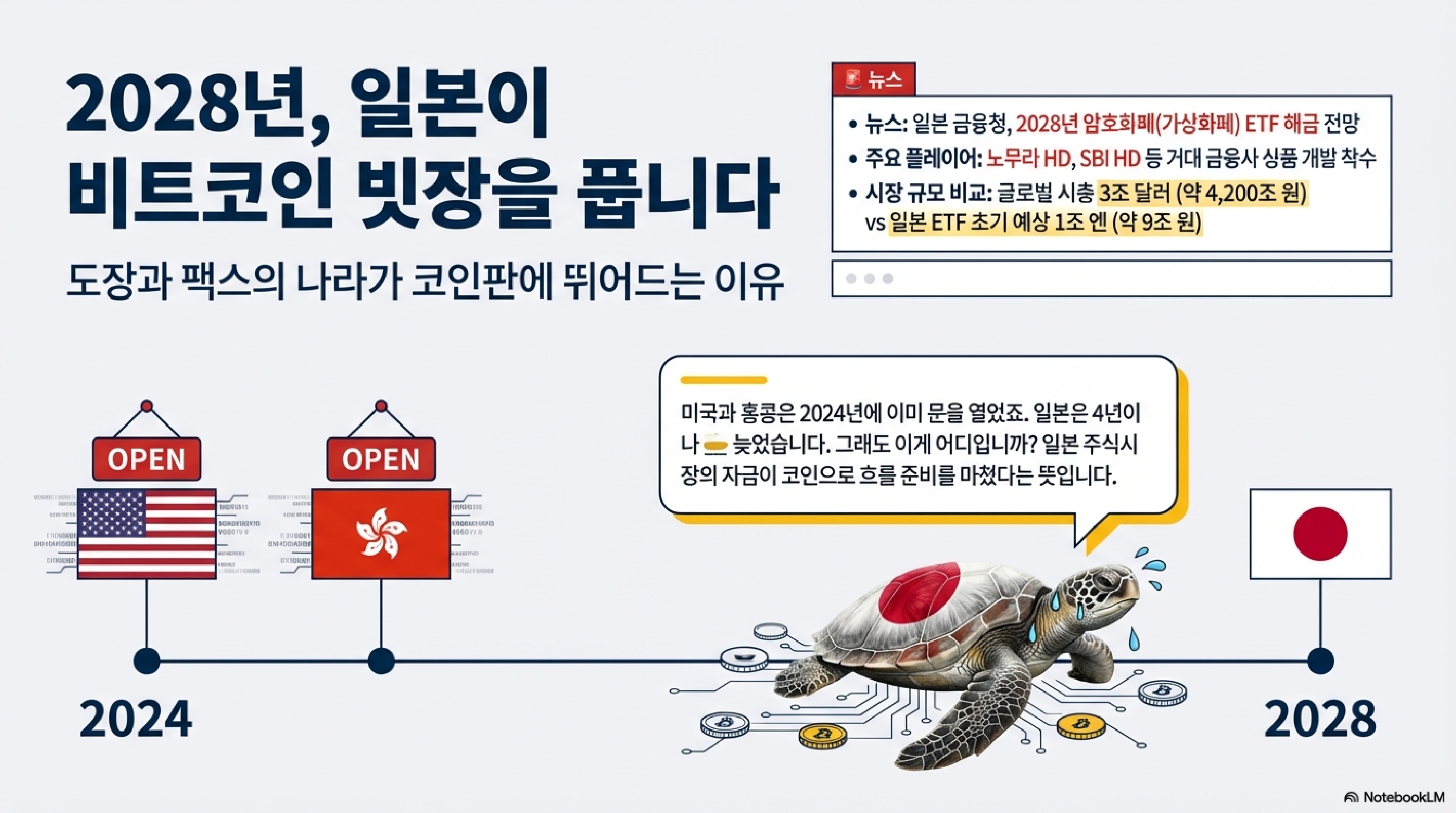 이미 미국과 홍콩은 2024년에 ETF를 승인하며 앞서나갔죠. 이건 일본이 혁신의 선두주자라서가 아니라, 아시아의 '크립토 허브' 자리를 놓고 벌이는 경쟁에서 더 이상 뒤처질 수 없다는 절박함의 표현으로 봐야 합니다.