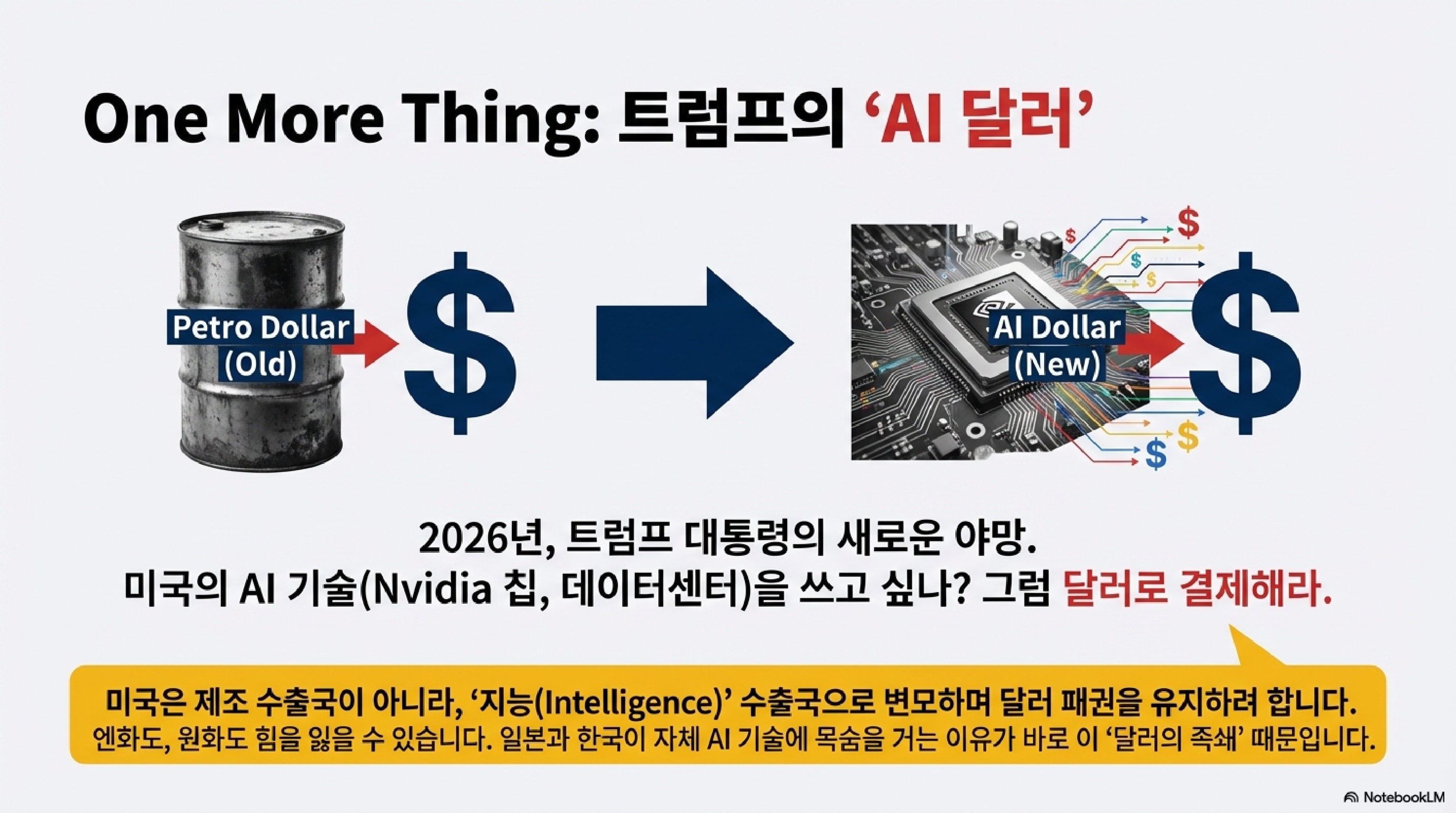 마지막으로, 바다 건너 미국에서는 트럼프 전 대통령이 AI 기술로 달러 패권을 지키려는 거대한 밑그림을 그리고 있다는 소식입니다. 반도체부터 AI 서비스까지 몽땅 묶어서 달러로만 팔겠다는데, 이게 과연 제2의 석유 패권이 될 수 있을지, 아니면 거대한 삽질이 될지.