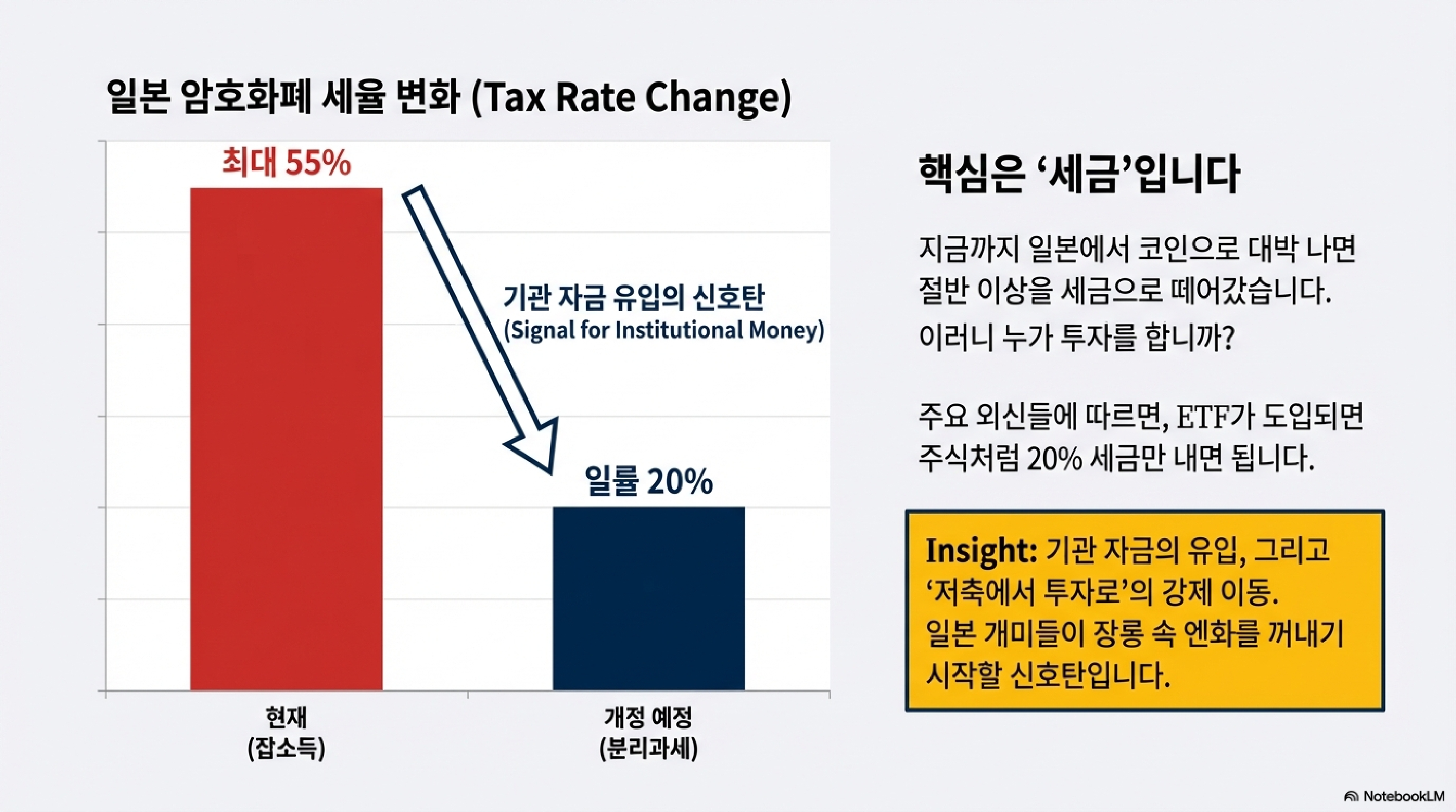 - 세금 혁명: 이게 진짜 하이라이트입니다. 지금까지 일본에서 암호화폐로 돈을 벌면 다른 소득과 합산해서 최고 55%의 무시무시한 종합소득세를 내야 했습니다. 그런데 이게 ETF로 들어오면? 주식과 똑같이 깔끔하게 20% 분리과세로 바뀔 가능성이 매우 높습니다. 이건 그냥 세금을 깎아주는 게 아니라, 사실상 "여러분, 마음 놓고 암호화폐에 투자하세요!" 라고 정부가 등을 떠밀어주는 신호탄이나 마찬가지입니다.