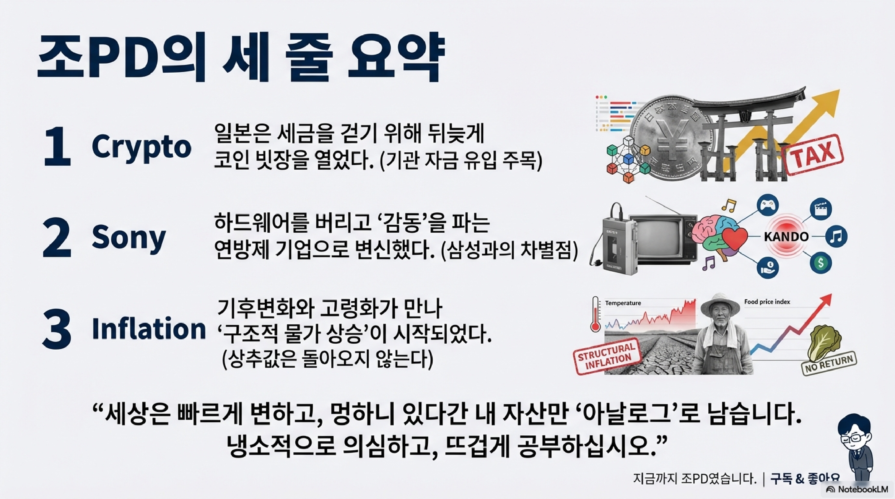 세상이 아무리 복잡하게 돌아가도, 돈의 흐름만 쫓아가면 본질이 보이는 법입니다. 다음 주에도 더 강력한 인사이트로 돌아오겠습니다. 지금까지 '조PD의 일본 경제'였습니다. 감사합니다!