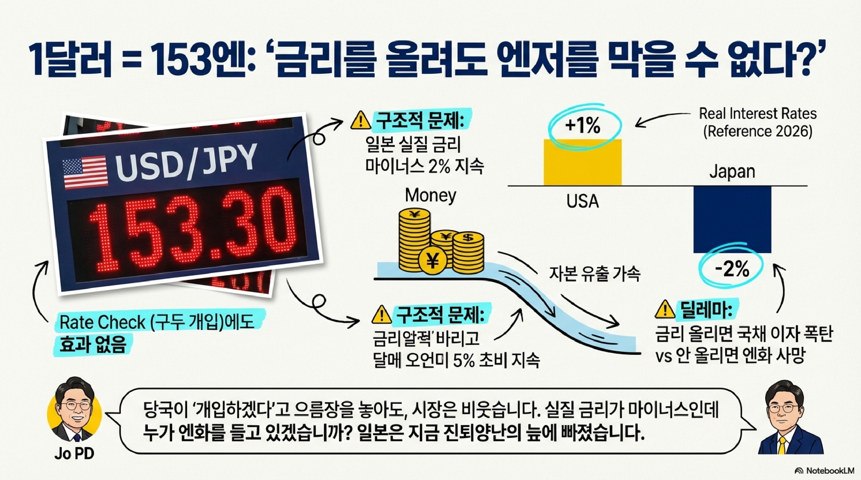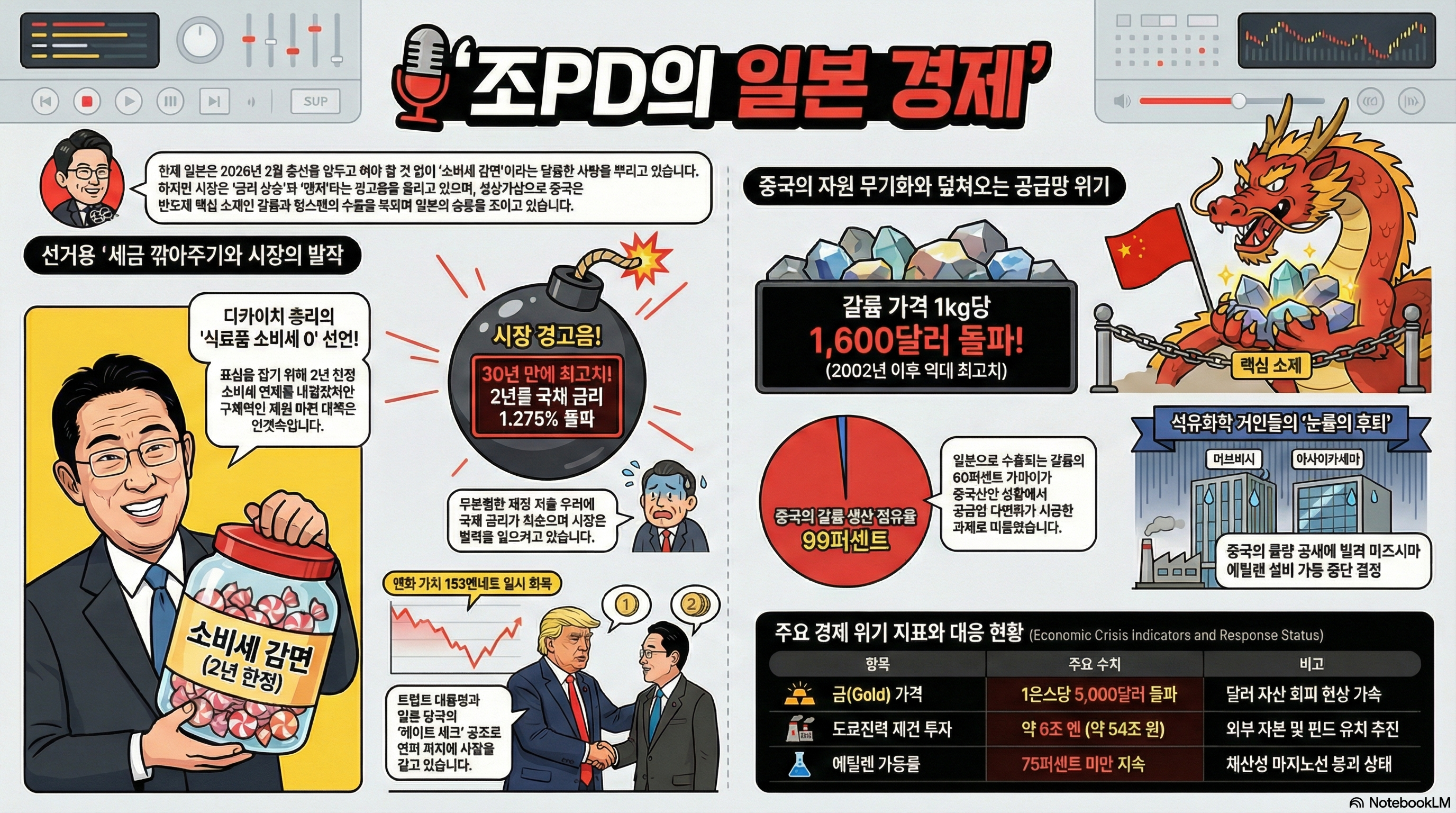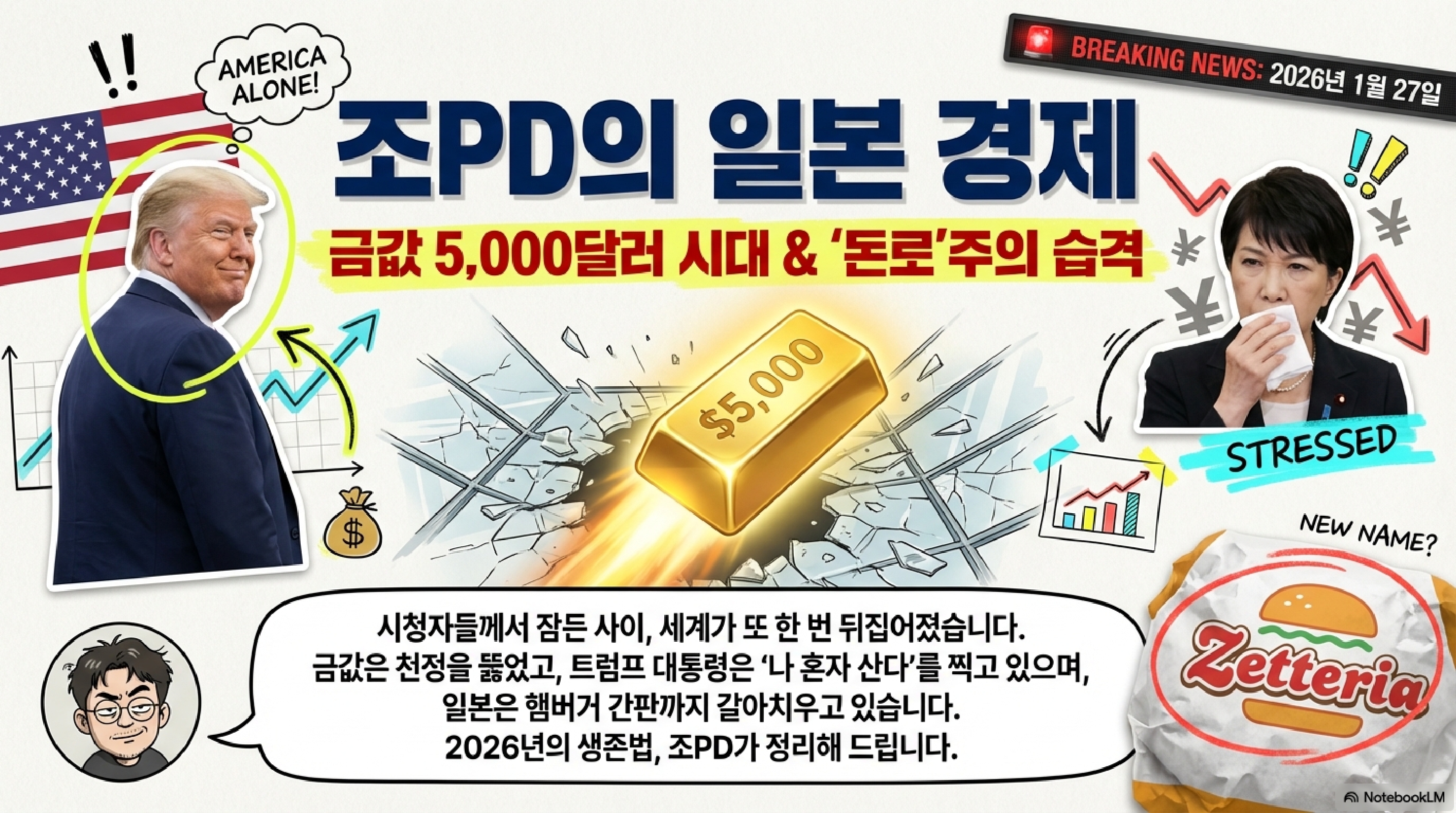 '조PD의 일본 경제'입니다. 2026년 1월의 마지막 주, 지금 일본은 그야말로 한 편의 블랙 코미디를 보는 듯합니다. 안에서는 갑작스러운 총선을 앞두고 여당이건 야당이건 "일단 세금부터 깎고 보자!"며 똑같은 노래를 부르는 포퓰리즘 대잔치가 벌어지고 있습니다. 밖을 보면 더 가관입니다. 세계 경찰을 자처하던 미국은 트럼프 대통령의 지휘 아래 동맹국에게 대놓고 "그 땅(그린란드) 좀 내놔봐"라며 지정학적 깽판을 치고 있고, 그 덕에 엔화 가치는 어디가 바닥인지 모를 정도로 추락하고 있죠. 여기에 더해 산업 현장에서는 중국이 "우리가 다 만들 테니 너희는 이제 그만 쉬어"라며 쏟아내는 공급 과잉 쇼크에 기간산업이 뿌리째 흔들리고 있습니다.
