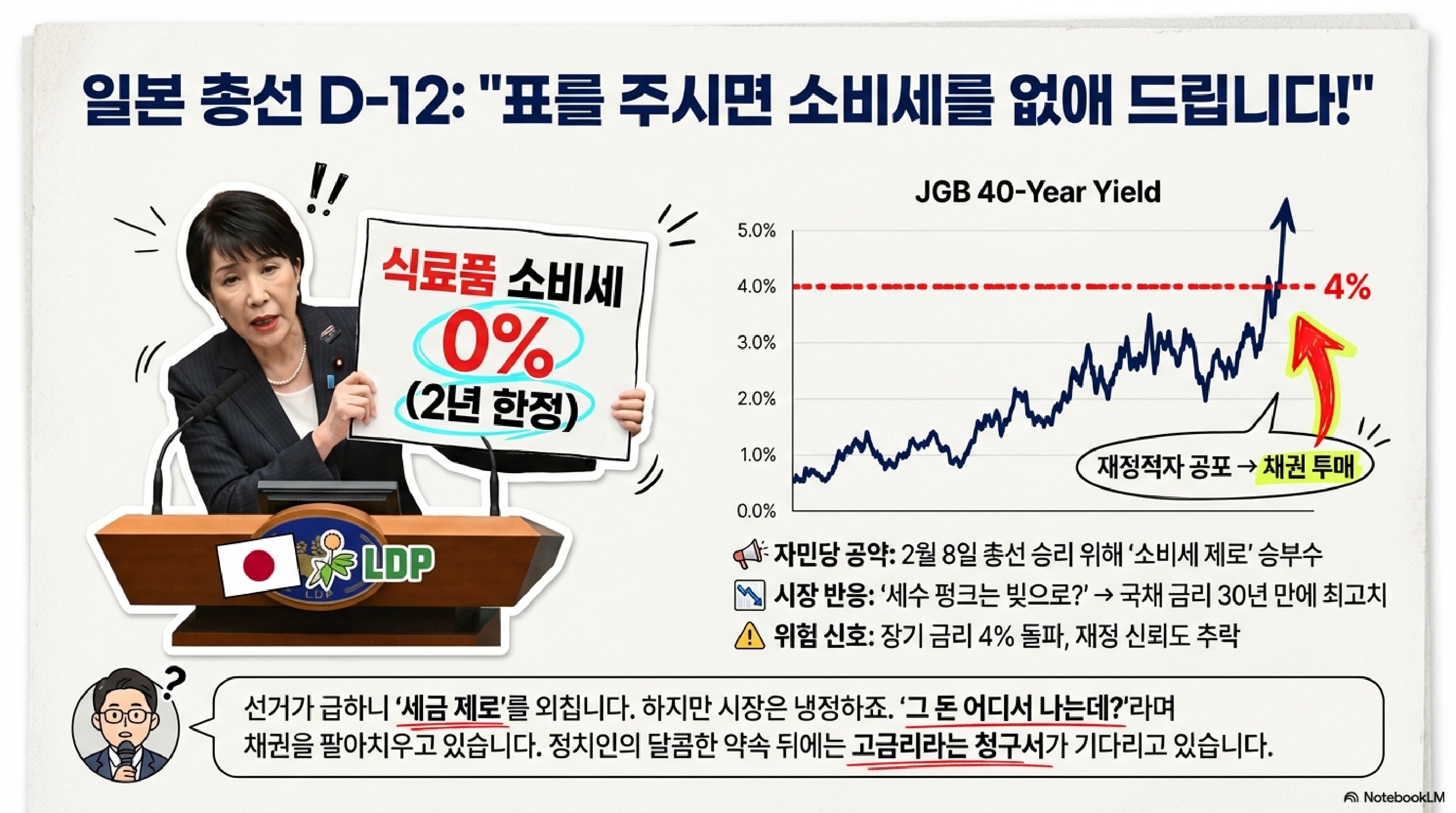 보시다시피 둘 다 식료품 소비세를 없애주겠다는 건데, 다카이치 총리는 "2년만 딱 해줄게"라는 입장이고, 노다 대표는 "아예 영원히 없애버리자"고 맞불을 놓고 있습니다. 진짜 코미디는 재원 조달 방안입니다. 주요 외신들에 따르면, 일본은 지금 재정 건전성에 대한 「市場の警鐘」(시장의 경고) 이 울리고 있습니다. 장기금리가 스멀스멀 오르면서 "너네 나라, 빚이 너무 많아!"라는 시장의 경고음이 들려오는데도, 정치인들은 "일단 쓰고 보자, 돈은 나중에 생각하고"라는 태도로 일관하고 있습니다.