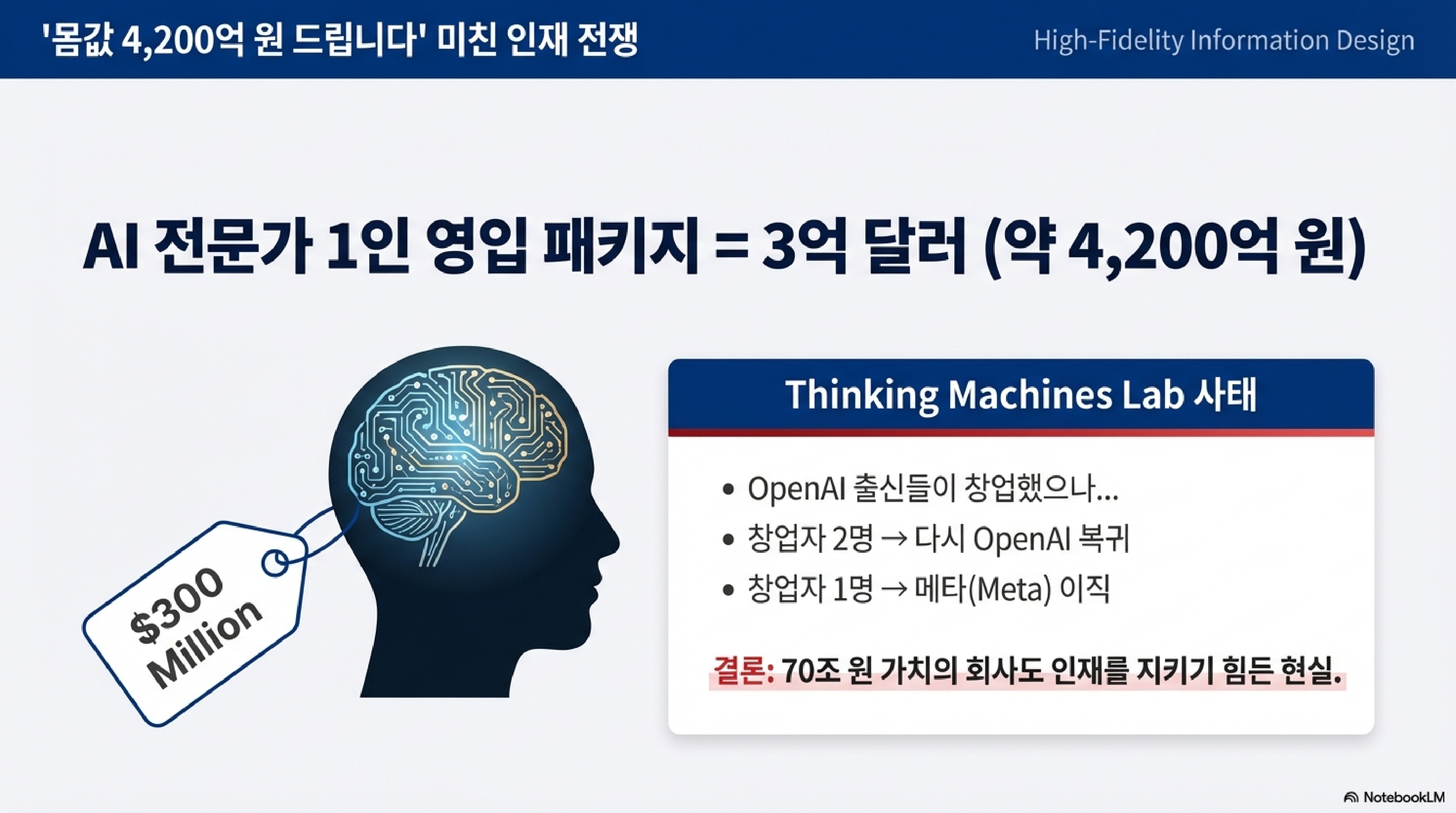 - 인재 유출 및 유지 (Talent Drain and Retention): 가장 큰 문제는 인재 확보 전쟁입니다. 거대 기술 기업 CEO들이 AI 전문가 한 명을 영입하기 위해 3억 달러, 우리 돈으로 약 4,200억 원 이상을 제시하는 시대에, 신생 네오랩들이 핵심 인력을 지켜내기는 거의 불가능에 가깝습니다. 실제로 'Thinking Machines Lab'은 공동 창업자들이 OpenAI와 Meta로 떠나는 아픔을 겪기도 했습니다.