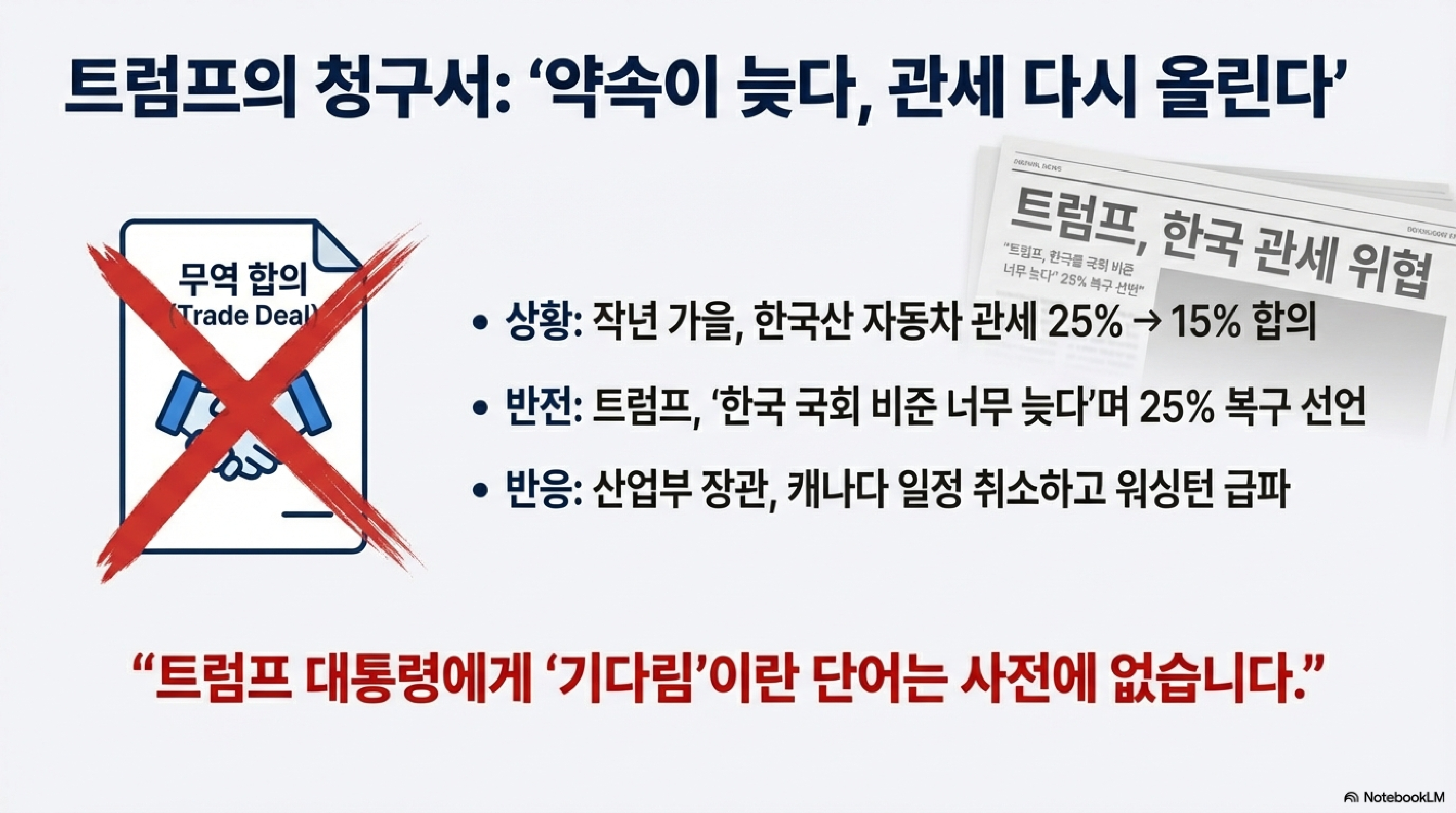 트럼프 대통령은 이런 절차적 차이를 이해하려 하지 않고, 그저 '약속 위반'이라며 압박의 수단으로 삼고 있는 것입니다.