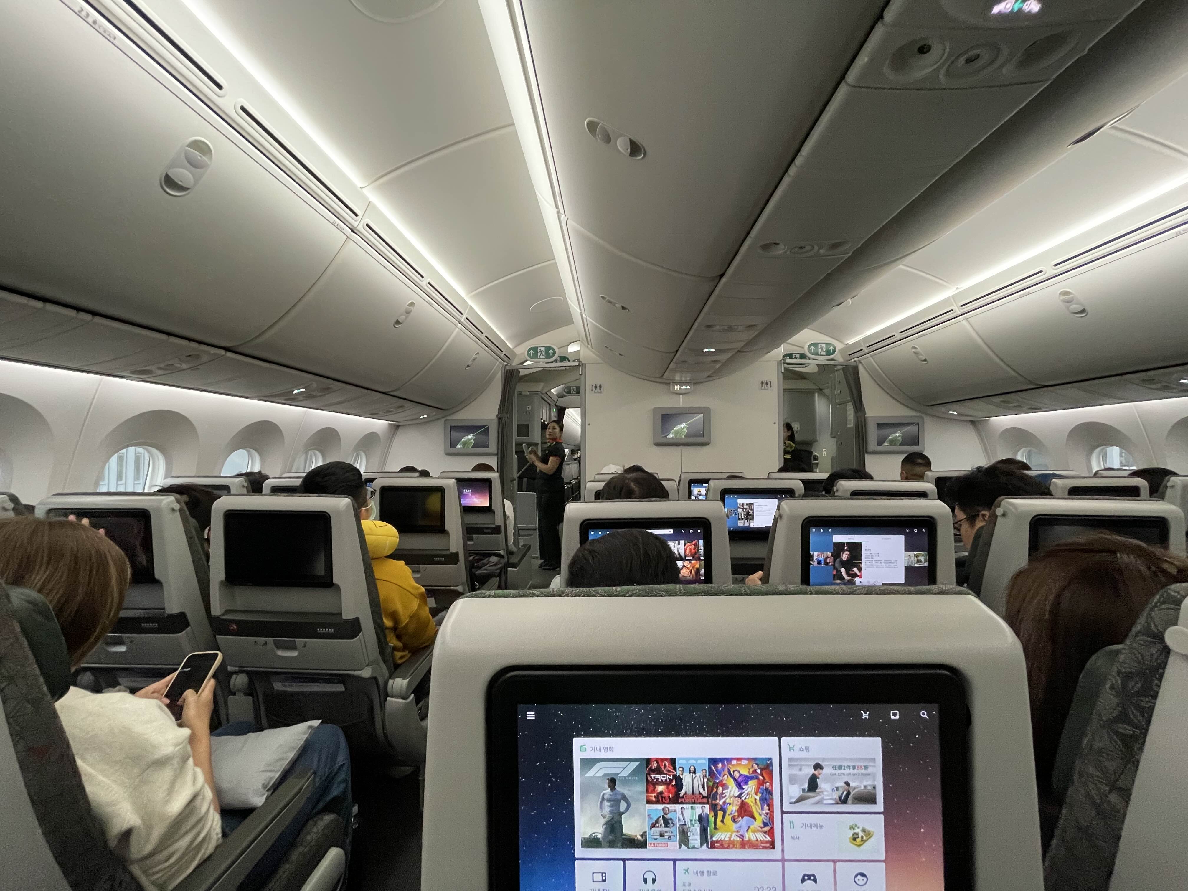 - 787-10의 이코노미 좌석은 큰 개인 엔터테인먼트 스크린, USB/전원 콘센트, 조절 가능한 헤드레스트를 갖춰 단거리 노선에서도 편안하며, 좌석 피치 31-32인치로 여유롭다.
