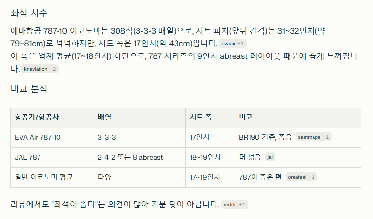 - 송산(TSA)에서 하네다(HND)로 가는 에버항공 BR190편은 보잉 787-10 기종으로 운항되며, 이코노미 클래스는 3-3-3 배열에 308석 규모다.