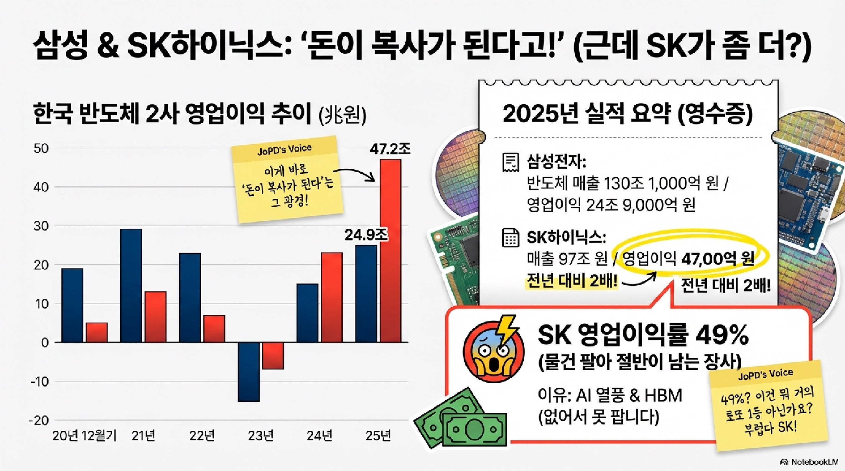 AI 열풍 덕에 이 HBM이 없어서 못 파는 지경에 이르렀고, 그 결과 삼성전자와 SK하이닉스는 역대급 실적을 기록했습니다. 삼성전자 반도체 부문은 2025년 매출이 사상 최고인 130조 1000억 원을 돌파했고, SK하이닉스는 영업이익이 두 배로 뛰었습니다. SK하이닉스 관계자는 "HBM의 공급이 수요를 따라가지 못하는 심각한 수급 불균형이 발생하고 있다"고 행복한 비명을 지를 정도입니다.