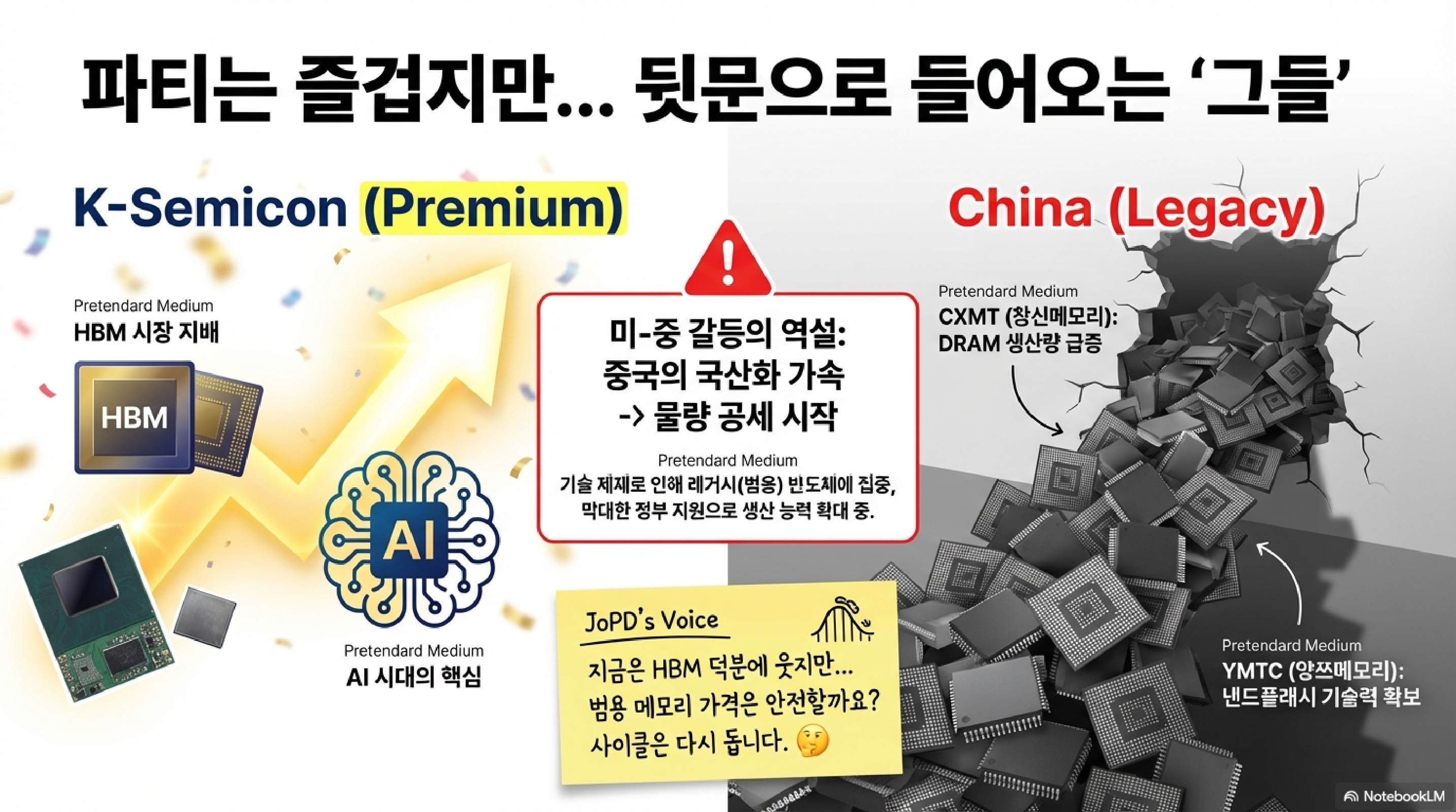 그런데 여기서 시청자들께서 주목하셔야 할 부분이 있습니다. 머스크의 이 거대한 도박이 한국 경제에는 엄청난 기회가 되고 있다는 사실입니다. AI 시대의 핵심 부품인 고대역폭 메모리(HBM) 때문입니다. HBM이 뭐냐고요? 일반 메모리가 2차선 도로라면, HBM은 데이터를 16차선으로 한 번에 실어 나르는 초고속 슈퍼 하이웨이라고 생각하시면 쉽습니다.