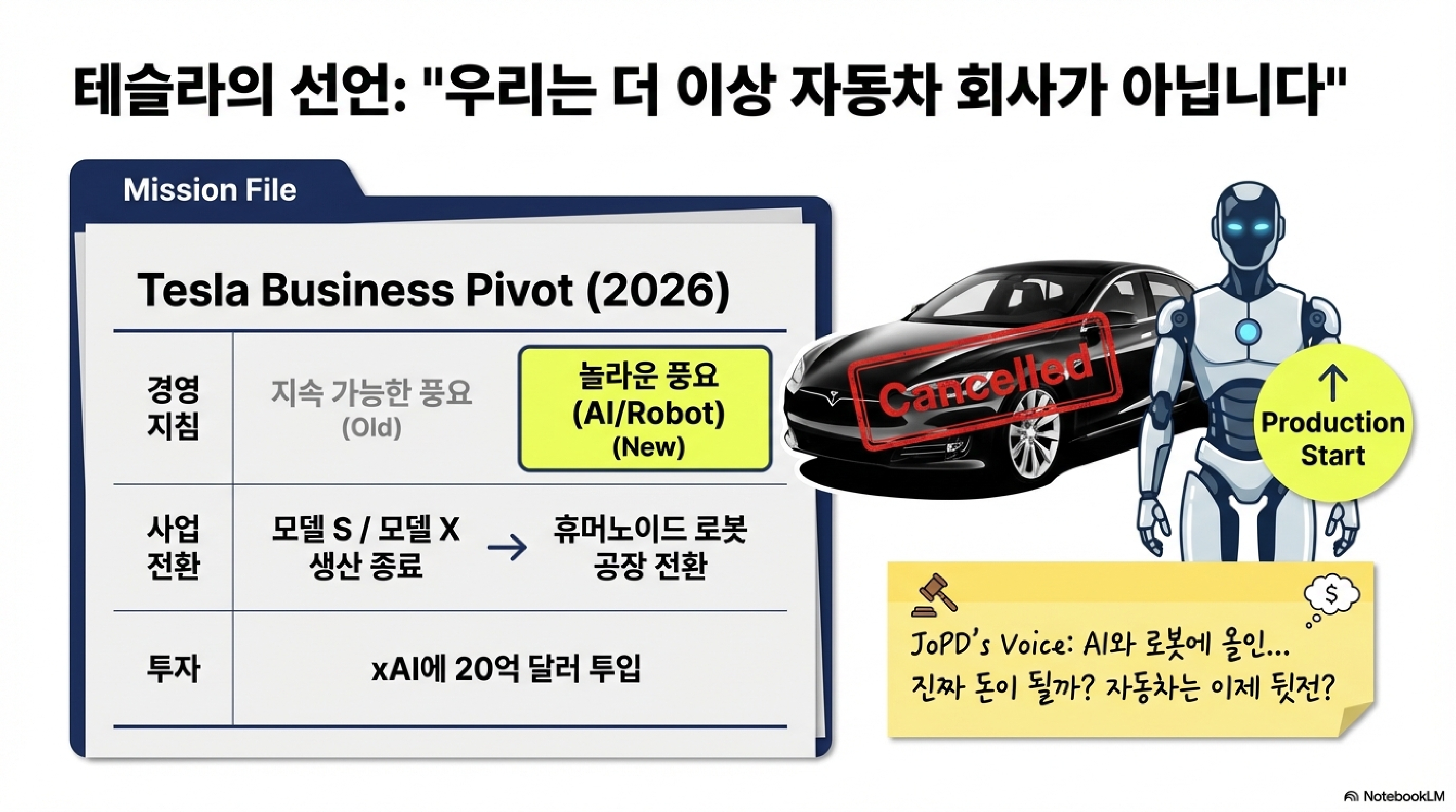 전기차 시대를 열었던 제국의 황제, 일론 머스크가 '이제 자동차는 그만'이라며 중대 발표를 했습니다. 이는 단순한 신제품 출시가 아니라, 테슬라라는 기업의 정체성을 자동차 제조사에서 인공지능(AI) 기업으로 송두리째 바꾸겠다는 선언입니다. 시청자들께서 타시던 테슬라가 구형 모델이 되는 건 시간 문제일지도 모르겠습니다.