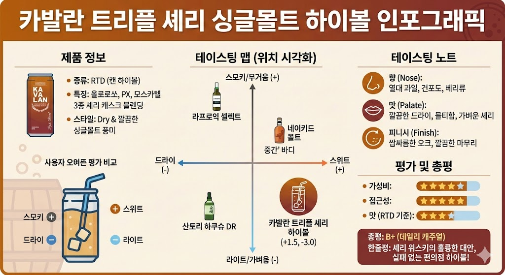 - 특징: 카발란 클래식 싱글몰트를 베이스로 하여, 올로로쏘(Oloroso), 페드로 히메네즈(PX), 모스카텔(Moscatel) 3가지 셰리 캐스크 원액을 블렌딩한 프리미엄 하이볼입니다. 제품명에 'Dry'가 붙은 만큼 당도를 낮추고 위스키 본연의 풍미를 살린 것이 특징입니다.