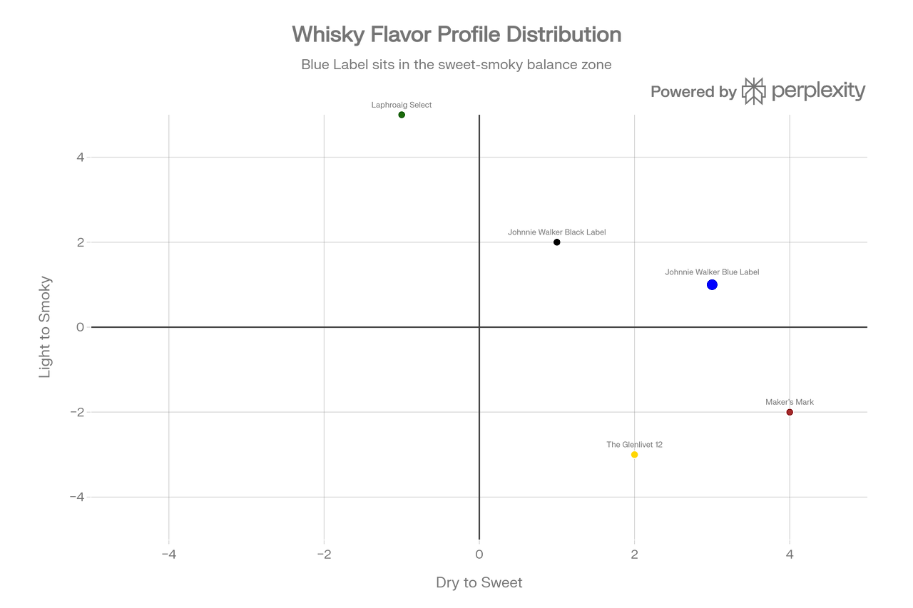 - 위치 분석: 조니워커 블루 라벨은 Sweet (+3)와 Light Smoky (+1) 영역에 위치합니다.