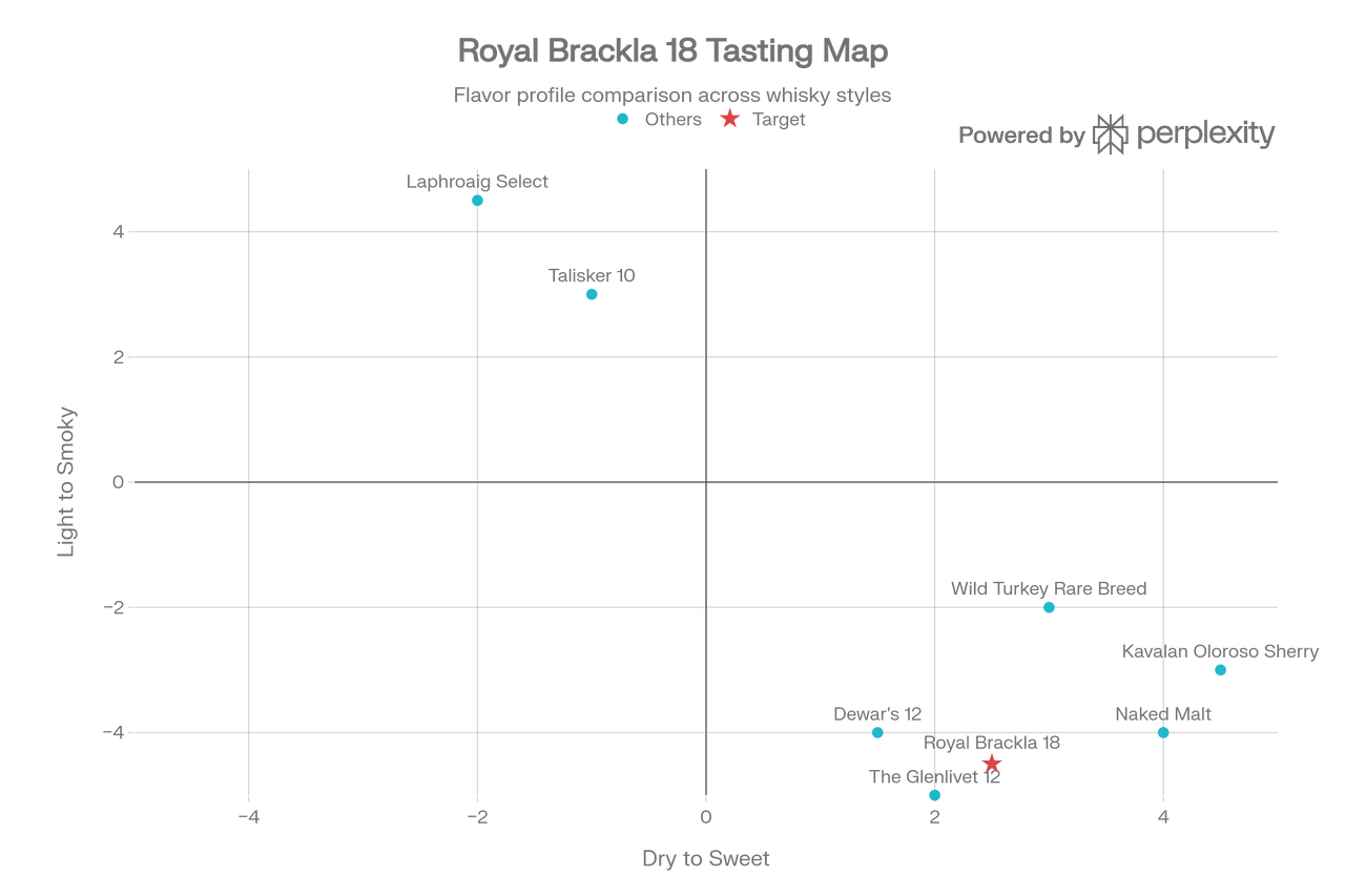 보유하신 위스키들과 비교했을 때, 로얄 브라클라 18은 피트감은 전혀 없으며(Light), 단맛은 네이키드 몰트나 카바란보다는 덜 직관적이지만 훨씬 복합적이고 은은한(Sweet) 위치에 있습니다.