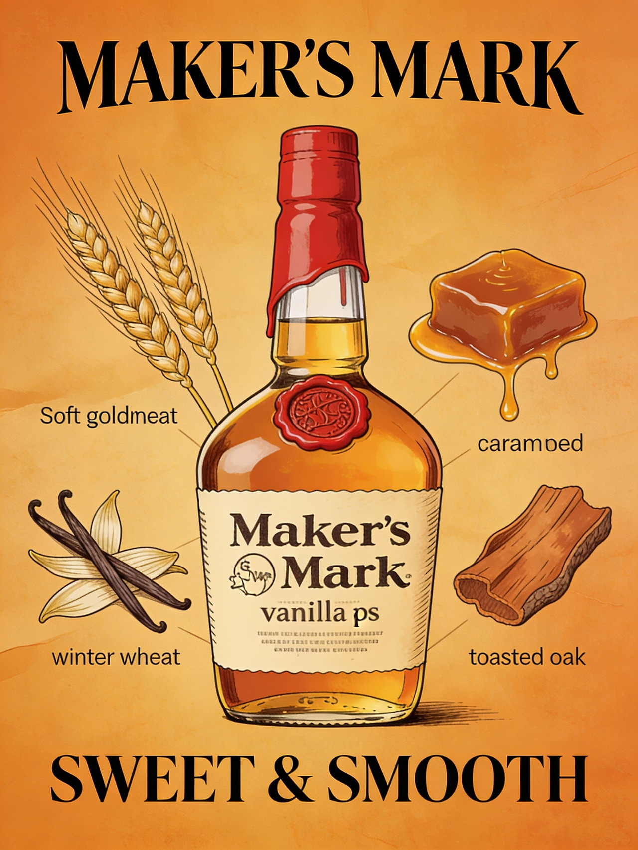 메이커스 마크의 가장 큰 특징은 원료입니다. 보통의 버번이 옥수수와 호밀(Rye)을 섞어 스파이시하고 거친 타격감을 주는 반면, 메이커스 마크는 호밀 대신 '밀(Wheat)'을 사용합니다. 덕분에 버번 특유의 거친 맛은 줄어들고, 빵처럼 고소하고 부드러운 단맛이 극대화되죠.