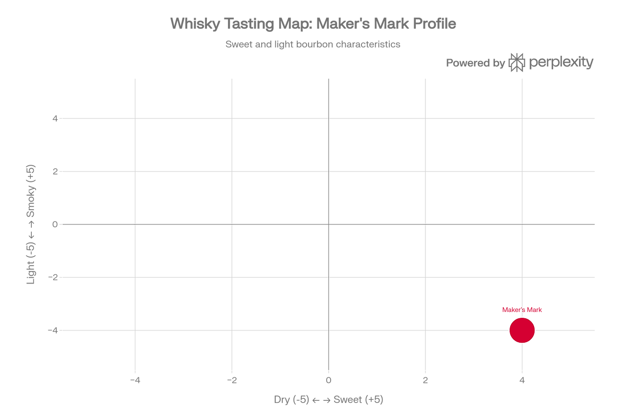 - 비교: 보유하신 탈리스커 10년이나 라프로익이 맵의 최상단(Smoky)에 있다면, 메이커스 마크는 정반대인 우측 하단(Sweet & Light)에 위치하여 극명한 대비를 이룹니다.