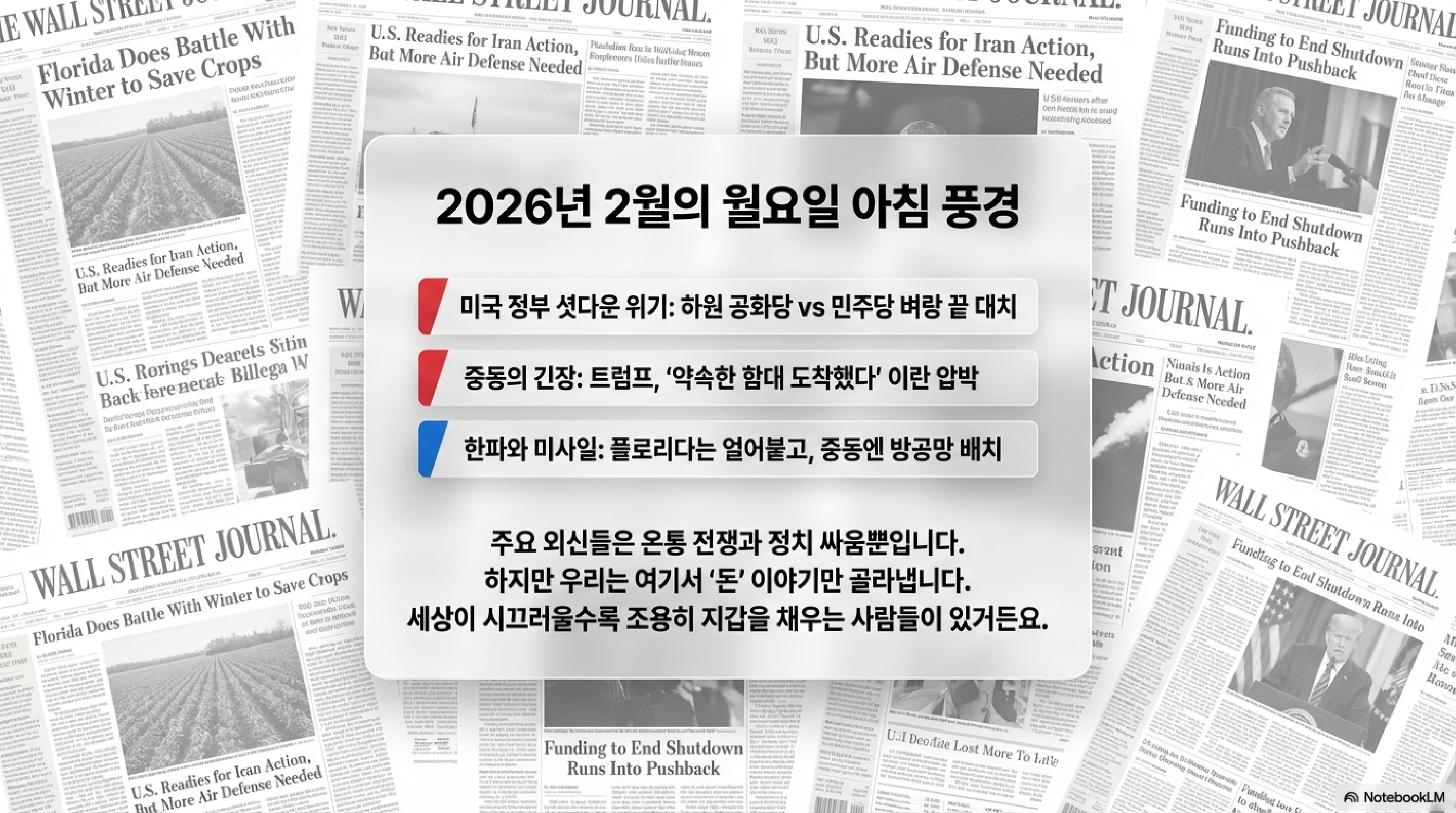시청자들께서도 느끼시겠지만, 2026년 2월의 시작이 아주 어질어질합니다. 미 해군 에이브러햄 링컨함이 이끄는 함대가 중동에 집결하며 전운이 감돌고 있고, 미국 정치권은 이민 정책 갈등으로 인한 정부 셧다운 때문에 한 치 앞을 모르는 핑퐁 게임 중이죠. 마치 기름칠 안 된 기계가 비명을 지르며 돌아가는 꼴인데, 이 혼돈의 연기 속에서도 돈 냄새는 기가 막히게 풍겨 나옵니다.