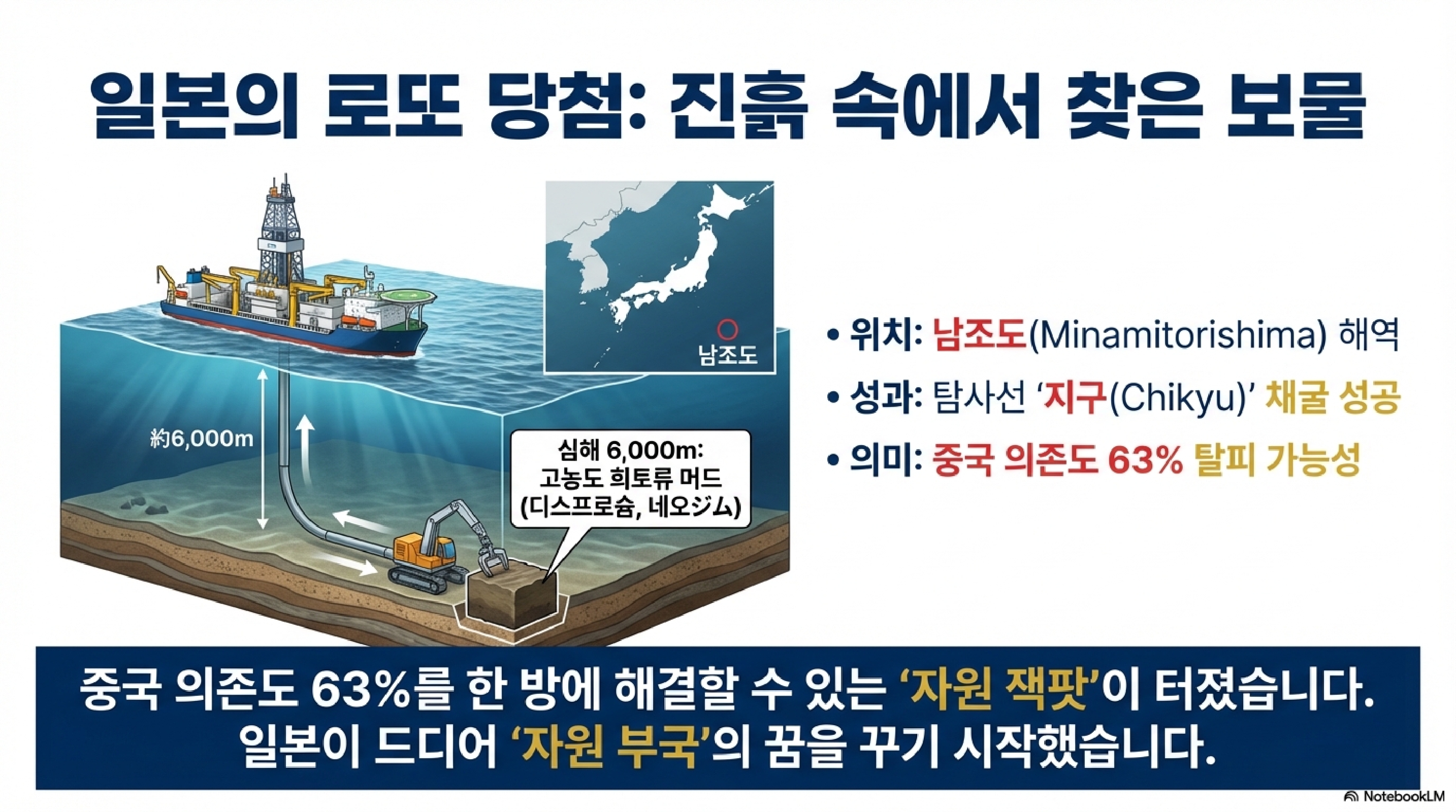 중국이 전 세계 생산량의 70%를 쥐고 흔드는 희토류 시장. 일본은 이 자원 무기화에 맞서 남조도(미나미토리시마) 인근 심해에 거대한 승부수를 던졌습니다. 최근 수심 6,000미터 해저에서 희토류가 포함된 진흙을 성공적으로 끌어올리는 데 성공했습니다.