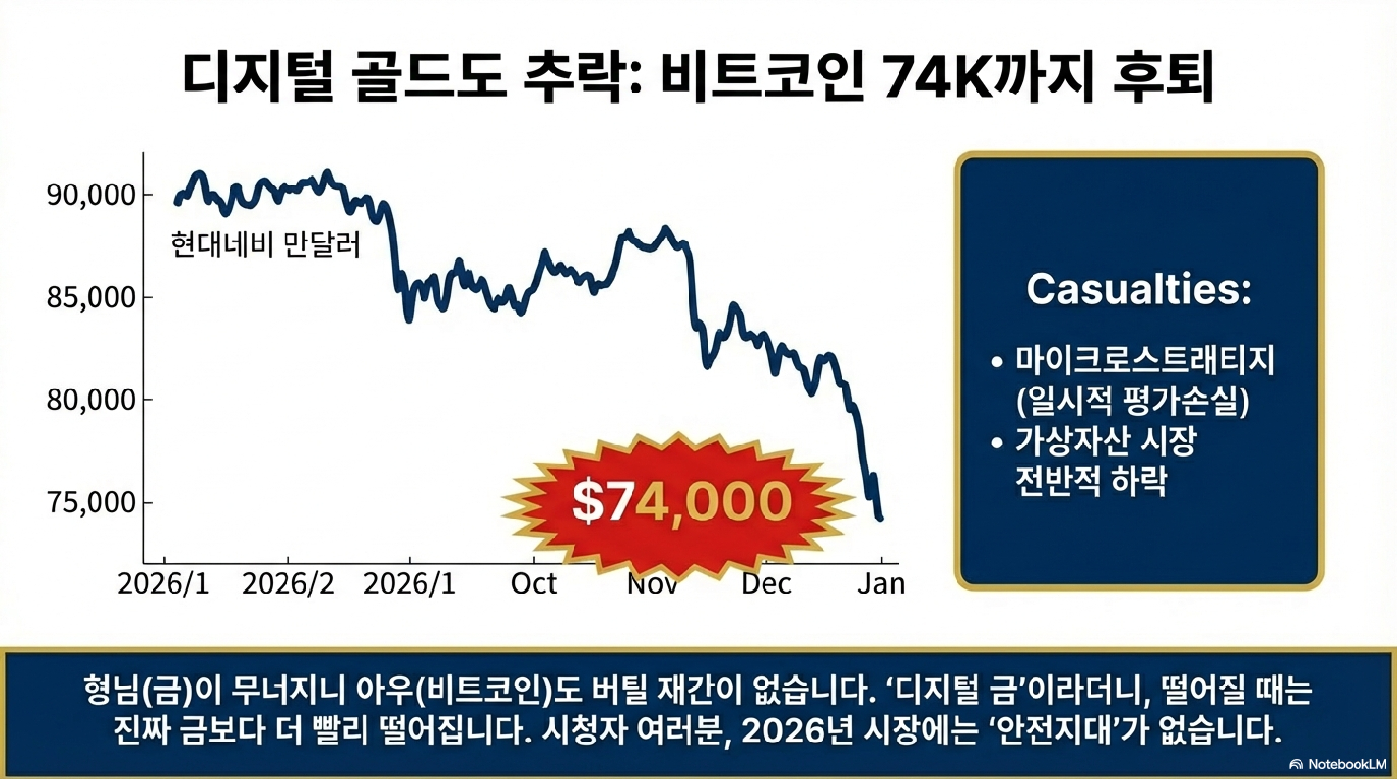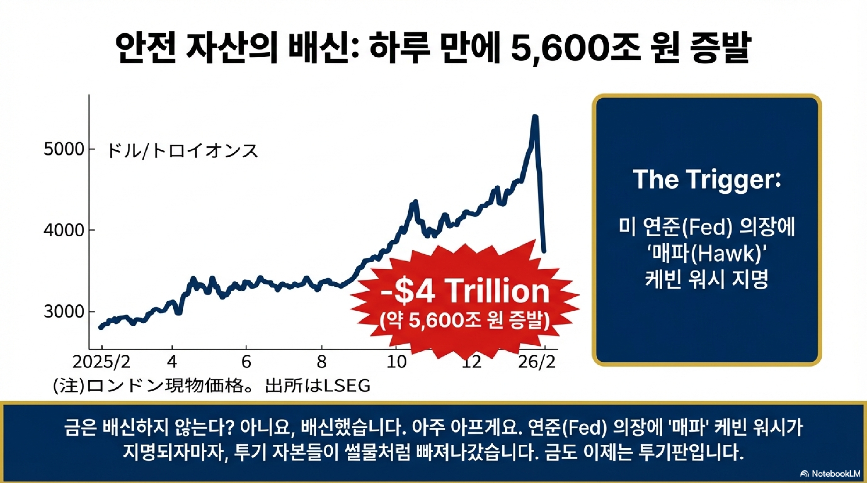 - 금융 시장의 비명: 시장은 이 '미지급 청구서' 같은 정치적 행보에 발작을 일으켰습니다. 특히 차기 Fed 의장으로 지명된 케빈 워시(Kevin Warsh)의 매파적 성향까지 더해지며 금값은 하루 만에 시가총액 **약 6,000조 원(4.3조 달러)**이 증발하는 역대급 폭락을 기록했습니다. 비트코인도 7만 4,000달러 선까지 밀렸고, 엔화는 달러당 155엔대를 돌파하며 요동치고 있습니다.