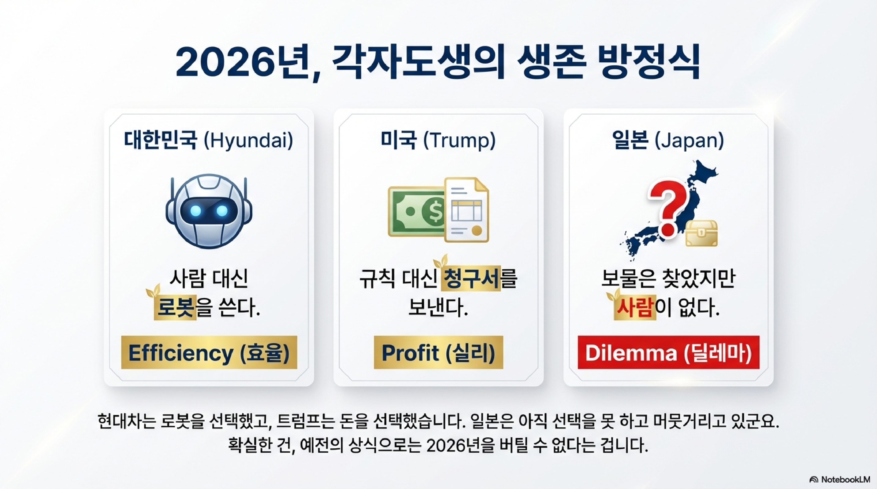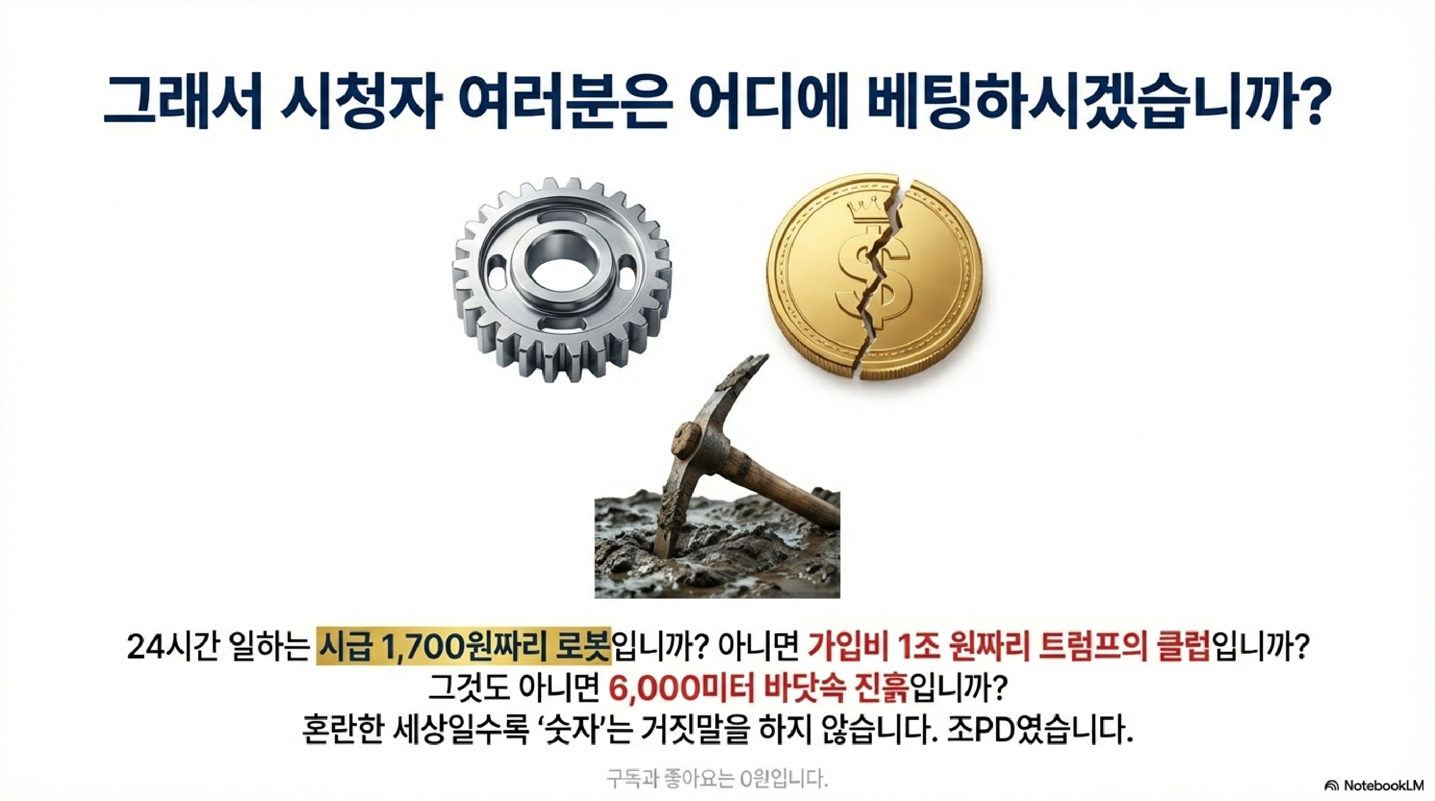 시청자 여러분, 일본은 지금 생존을 위해 6,000미터 심해를 파고 있고, 현대차는 공장에 로봇을 심고 있습니다. 정치가 시스템을 망가뜨릴 때 기업과 국가는 혁신으로 응전하고 있는 것이죠. 그렇다면 여러분의 투자 포트폴리오는 지금 어디에 있습니까? 그저 정치인들의 달콤한 약속에만 기대를 걸고 계신 건 아닌지 돌아볼 때입니다.