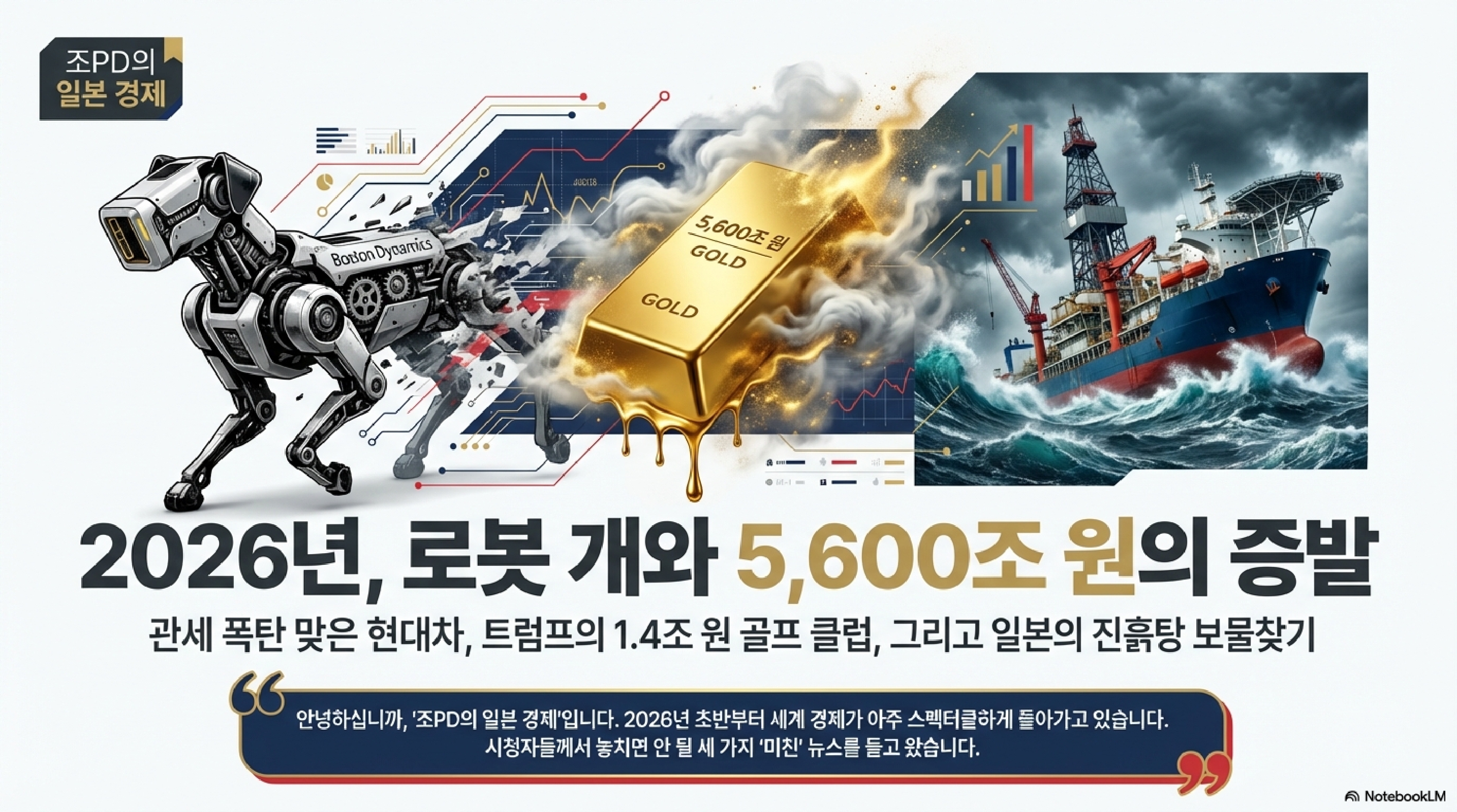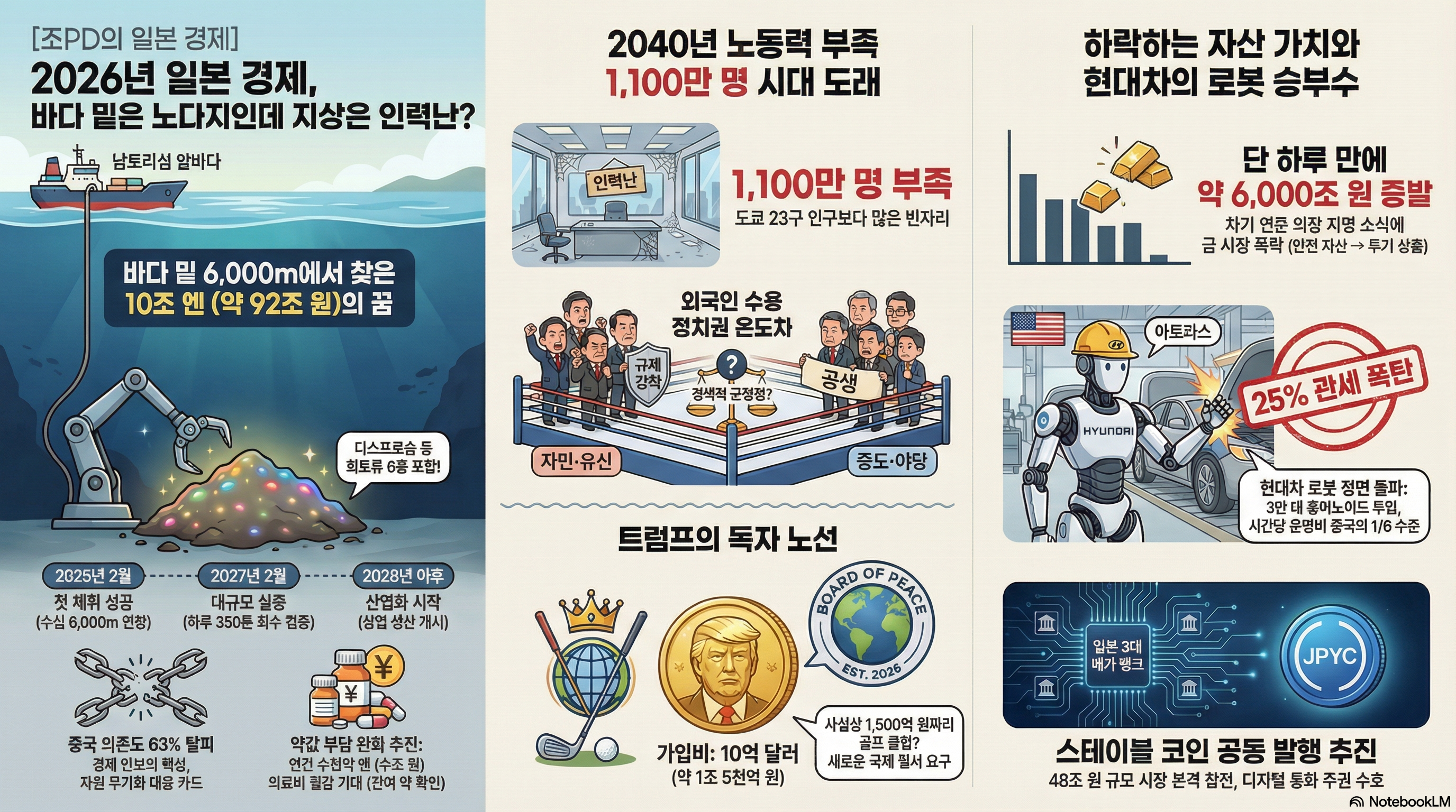 오늘 다룰 네 가지 핵심 주제는 이렇습니다. 첫째, 약사가 약을 깎아주는 일본의 파격적인 의료비 절감 대책, 둘째, 중국에 맞서 6,000미터 바다 밑 진흙을 퍼 올리는 일본의 희토류 독립 선언, 셋째, 1.4조 원짜리 입장료를 받는 트럼프 현 대통령의 기묘한 '평화 클럽', 마지막으로 관세 전쟁의 해결사로 등판한 현대차의 로봇 부대 이야기입니다.