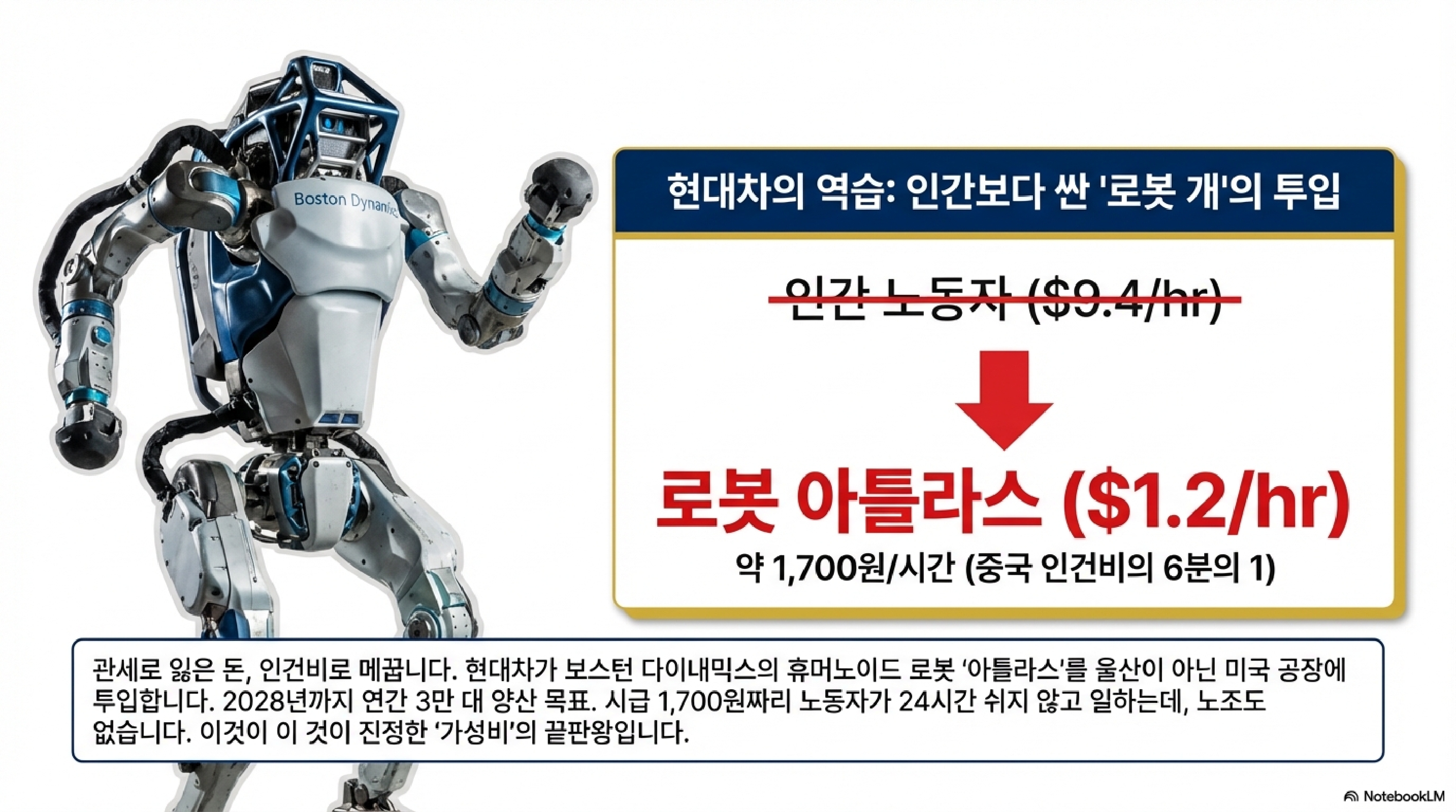 트럼프 행정부의 25% 고관세 압박은 제조 기업들에 사형 선고나 다름없습니다. 실제로 현대차와 기아는 관세 폭탄이 떨어진 2025년 4월부터 11월 사이, 북미 사업에서만 약 7조 원의 손실을 본 것으로 추정됩니다. 이 위기를 돌파하기 위해 현대차가 꺼낸 카드는 휴머노이드 로봇 '아틀라스' 3만 대입니다.