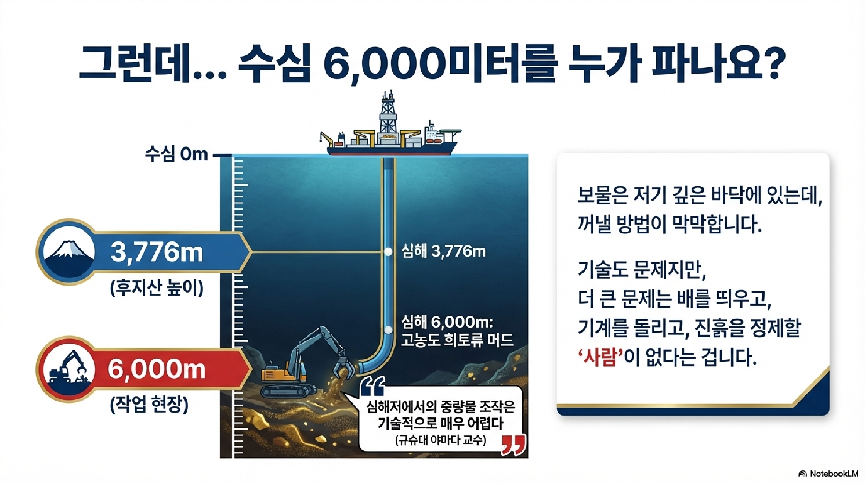 - 에베레스트를 거꾸로 오르는 난이도: 수심 6,000미터에서 진흙을 퍼 올리는 게 말처럼 쉽겠습니까? 큐슈대학의 야마다 교수는 '심해저에서의 중량물을 복잡하게 리모트 조작하는 것' 자체가 기술적으로 엄청난 도전이라고 지적합니다. 하지만 일본은 '치큐'라는 탐사선을 동원해 하루 350톤 회수를 목표로 기술 실증에 박차를 가하고 있습니다.