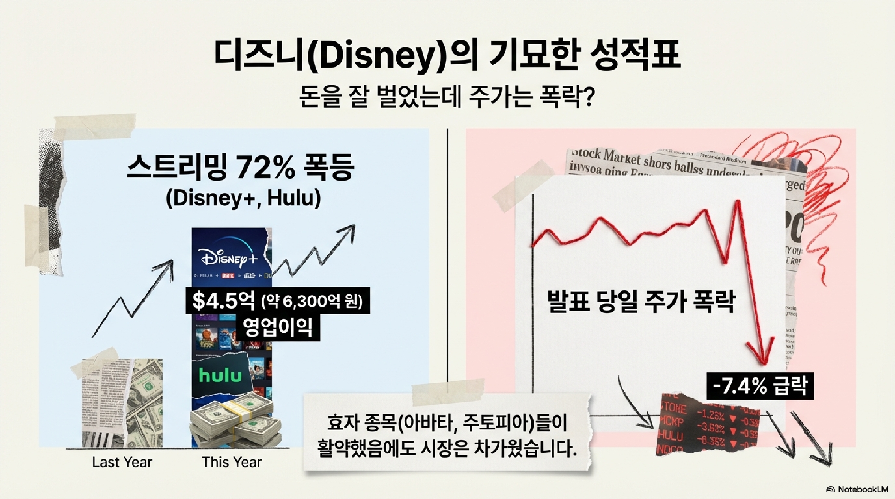 디즈니 실적 발표 보셨습니까? 스트리밍 사업인 디즈니 플러스와 훌루가 영업이익 4.5억 달러, 한화 약 6,300억 원을 기록하며 72%나 성장했습니다. 그런데 주가는 7.4%나 폭락했죠. 왜일까요? 바로 비용의 함정 때문입니다. 스포츠 중계권료는 미친 듯이 솟구치고 있고, 유튜브 TV와의 전송료 싸움 때문에 발생한 블랙아웃으로 고작 보름 만에 1.1억 달러, 우리 돈 약 1,540억 원을 날려 먹었습니다.