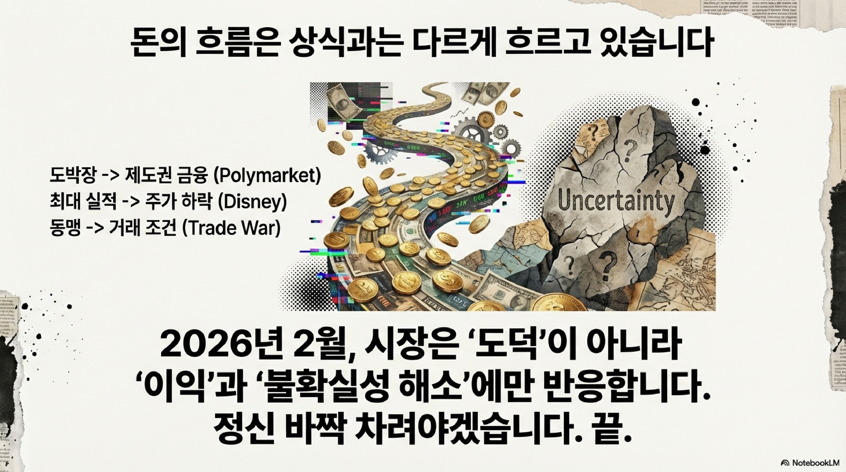 2026년 2월의 시작이 참으로 떠들썩합니다. 시장은 어수선하고 자본의 흐름은 종잡을 수 없는데, 그 중심에는 항상 한 명의 거물과 그를 비호하는 현 대통령 행정부의 거대한 그림자가 드리워져 있습니다. 누군가는 혁신이라 부르고 누군가는 욕망의 질주라 부르는 이 아수라장 속에서, 오늘은 우주로 도망간 억만장자의 야심부터 FBI 수사 대상에서 신분 세탁에 성공한 베팅 사이트, 그리고 국가 간의 화끈한 뒷거래와 디즈니 성 안에서 벌어지는 추악한 왕좌의 게임까지 네 가지 맛깔나는 소식들 파헤쳐 보겠습니다.