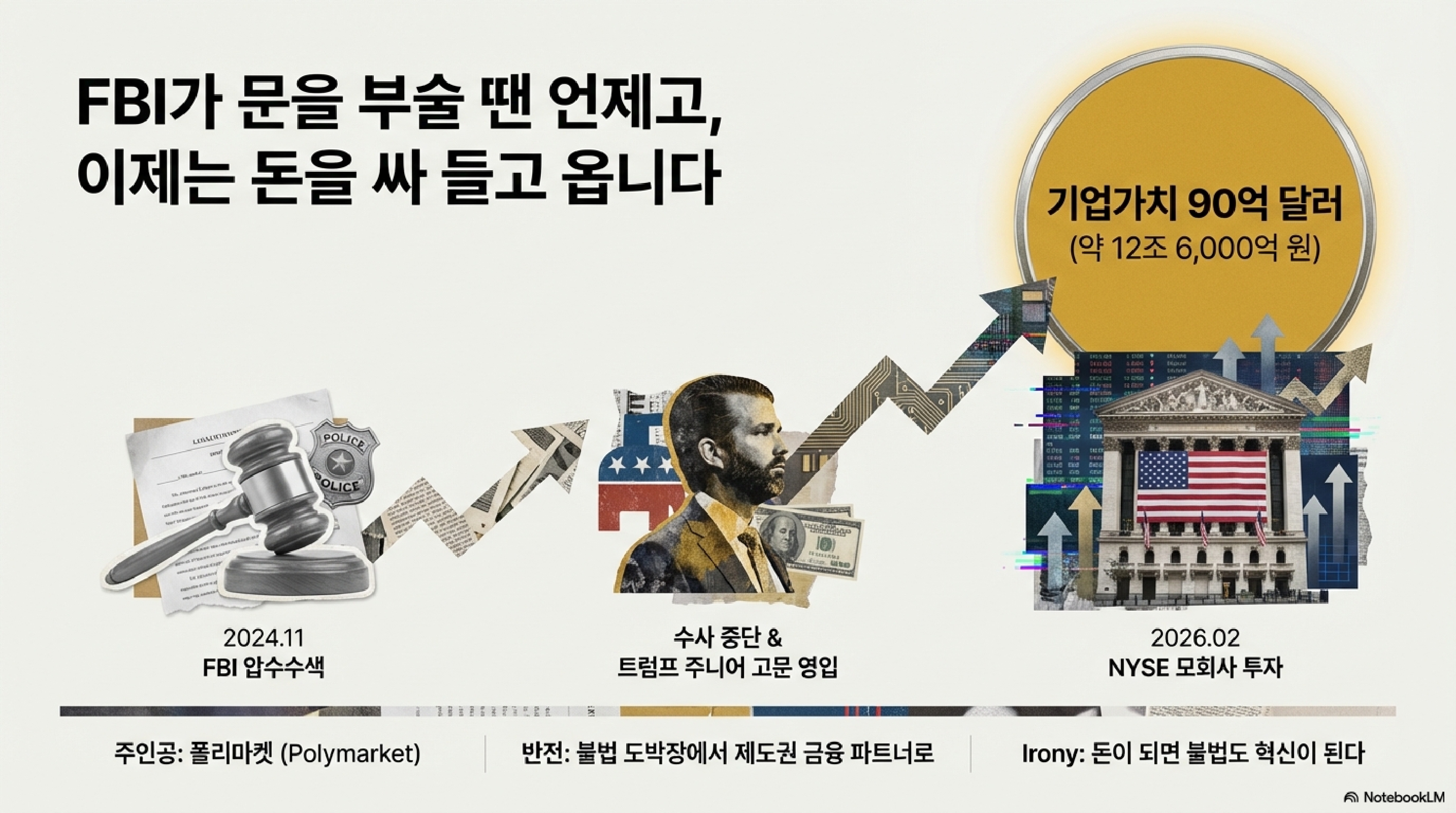 불과 십여 개월 전만 해도 이 친구, 인생 종 치는 줄 알았습니다. 폴리마켓의 CEO 쉐인 코플란 말입니다. 2024년 11월에 뉴욕 펜트하우스에서 자다가 FBI한테 휴대폰 뺏기고 수사받던 그 청년이, 이제는 90억 달러, 한화로 약 12.6조 원짜리 기업의 수장이자 억만장자가 됐습니다. 이게 어떻게 가능했냐고요? 줄을 아주 기가 막히게 섰거든요. 현 행정부의 실세인 트럼프 주니어의 벤처 캐피털이 투자자로 참여하고, 본인은 자문으로 합류했습니다. FBI가 문을 부수고 들어오던 회사가 이제는 뉴욕증권거래소 모기업의 투자를 받는 기적의 세탁소로 변신한 겁니다.