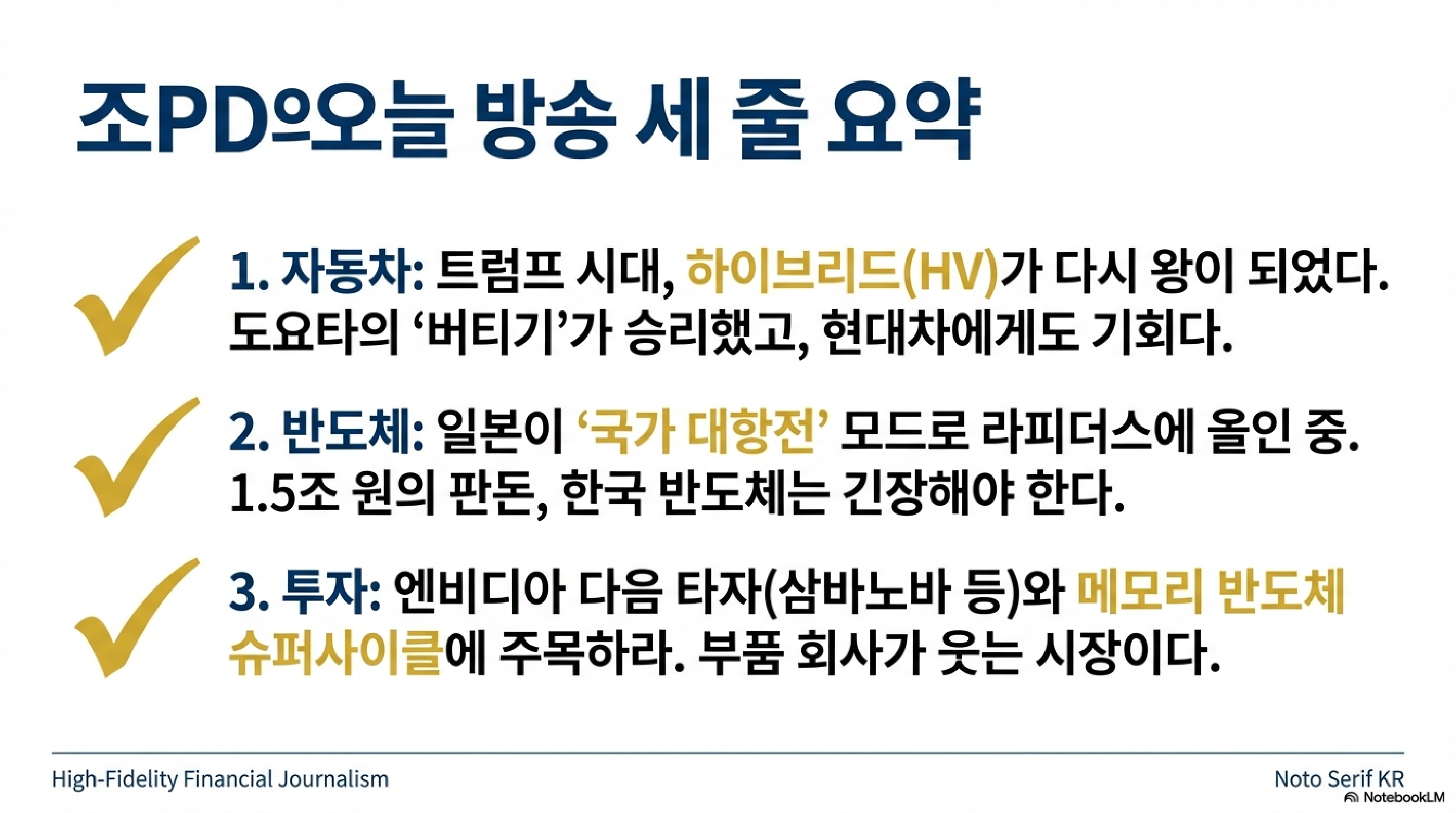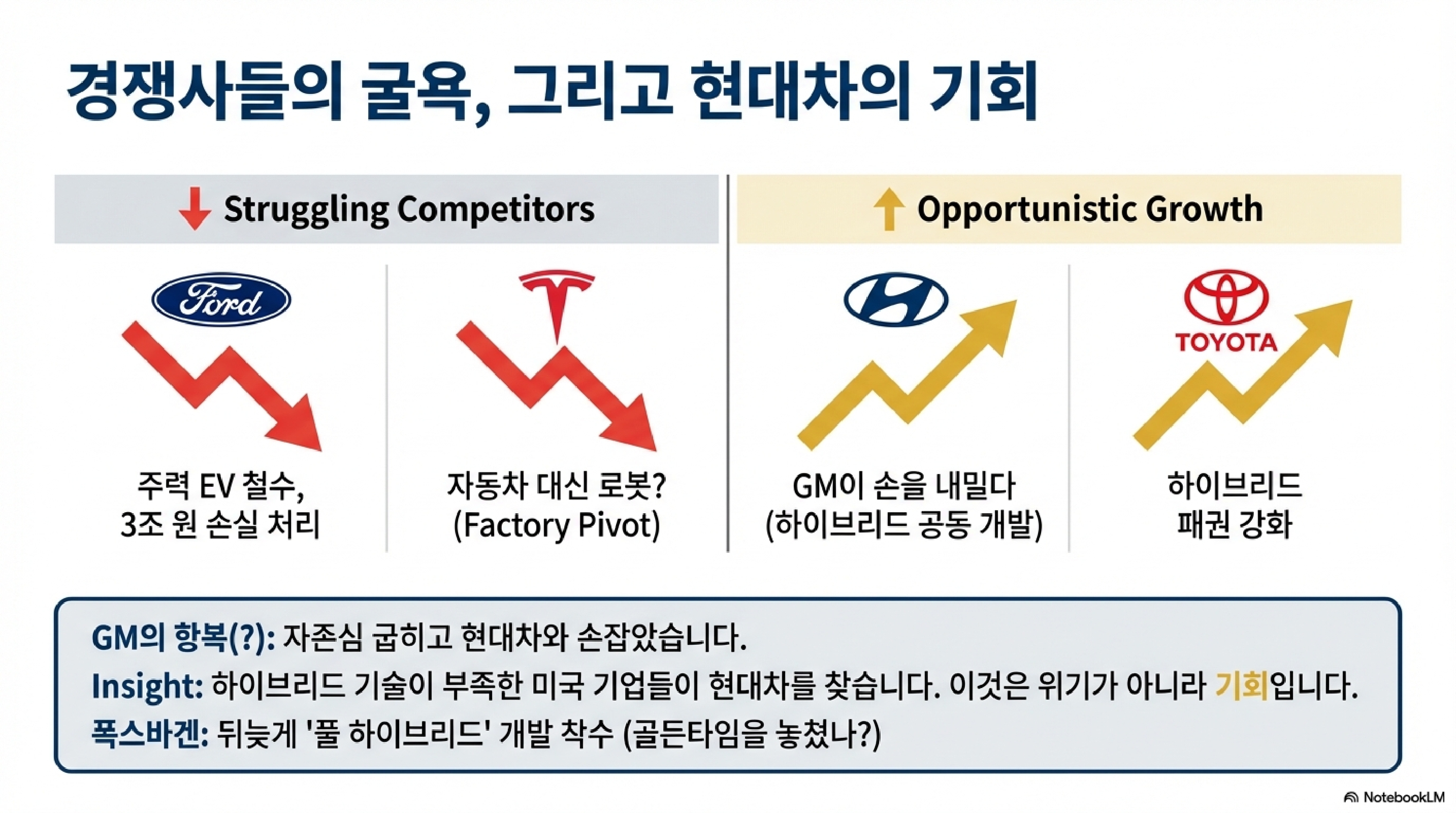 시청자들께서도 요즘 도로 위를 보시면 뭔가 분위기가 달라진 걸 느끼실 겁니다. 세상을 다 씹어먹을 것 같던 전기차들의 기세는 어디 가고, 구닥다리 취급받던 엔진차의 변종 하이브리드들이 다시금 도로의 주인공으로 복귀하고 있습니다. 오늘 첫 번째 주제는 하이브리드로 판을 다시 짠 토요타의 대격습, 그리고 한때는 우러러보던 미국 GM이 우리 현대자동차에 사실상 항복 선언을 하며 손을 내민 배경을 파헤쳐 봅니다.