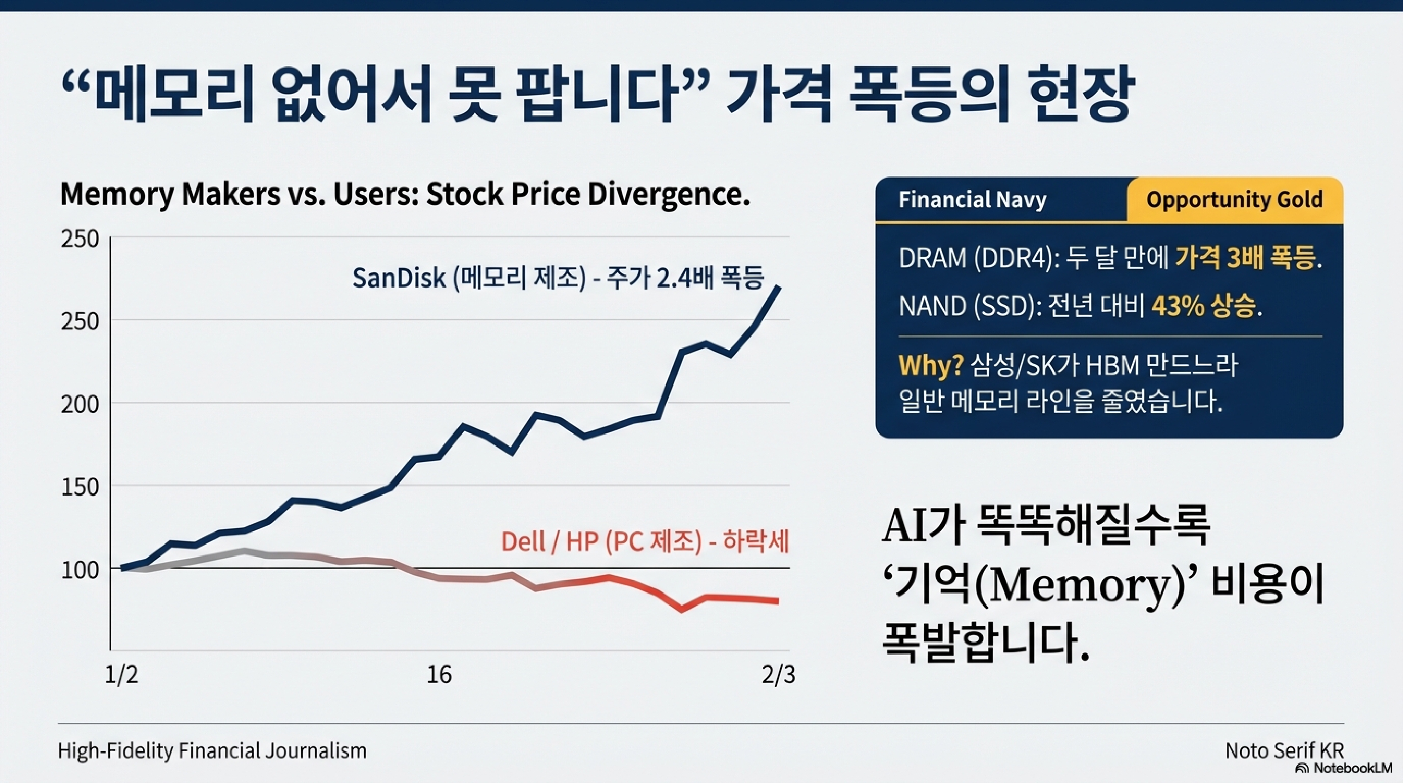 미국 산디스크의 주가를 보십시오. 지난 1월 한 달 동안만 주가가 2.4배로 뛰며 기존 가격의 240%에 도달하는 기염을 토했습니다. AI 인프라를 지으려는 기업들의 탐욕이 메모리 가격을 밀어올린 결과입니다. 반면 델이나 HP 같은 PC 제조사들은 굶주린 사람이 금박 입힌 스테이크를 보는 격입니다. 고기값이 너무 올라서 정작 자기는 한 입도 못 먹는 처지죠. 메모리 제조사들이 돈 되는 AI용 반도체에만 공장을 돌리다 보니, 정작 PC에 들어갈 일반 메모리는 씨가 마르고 가격만 폭등했기 때문입니다.