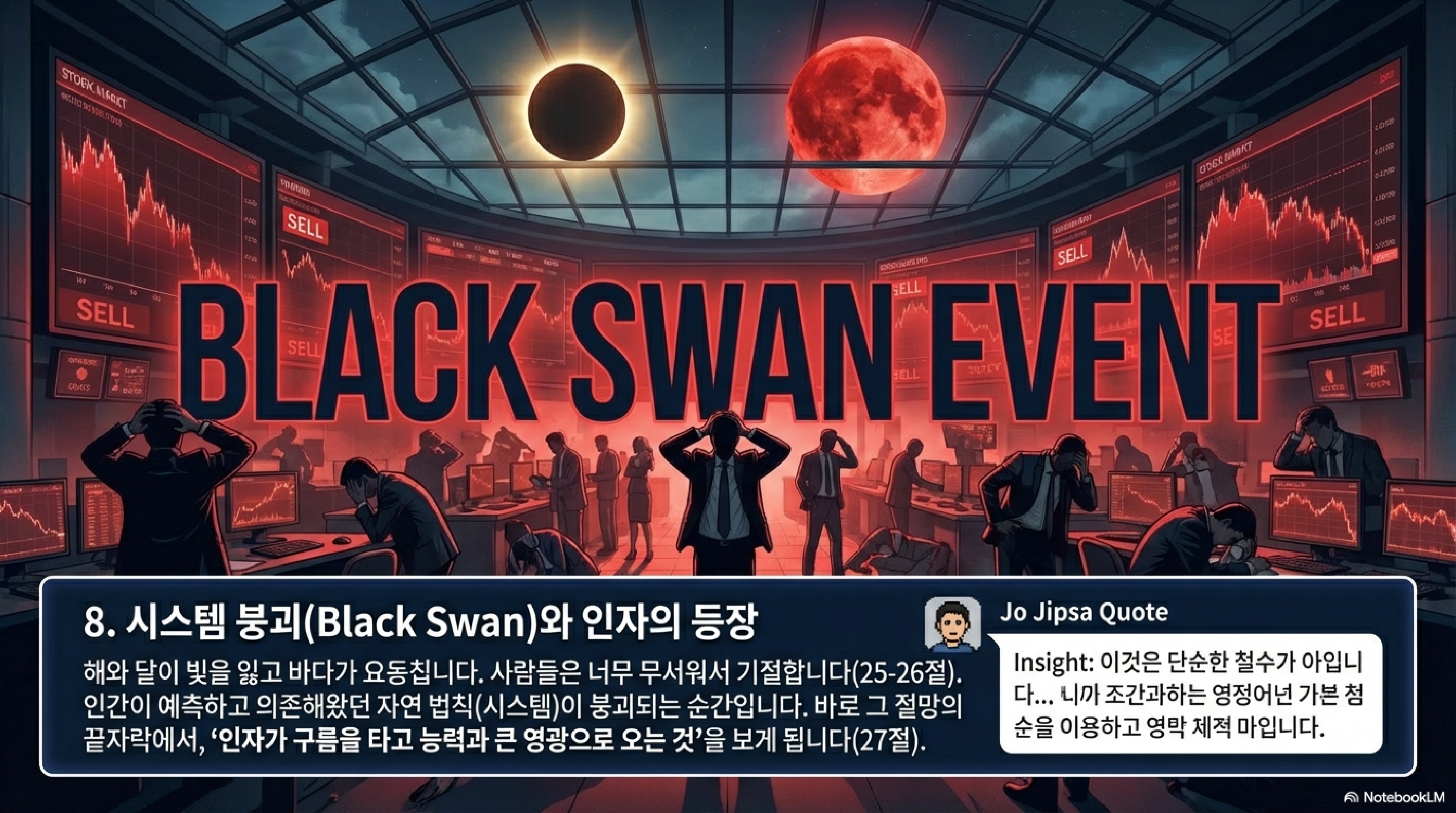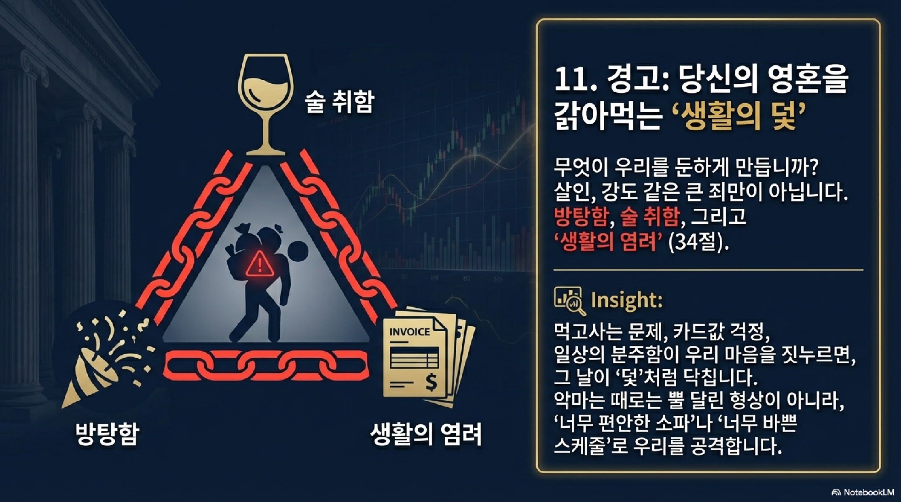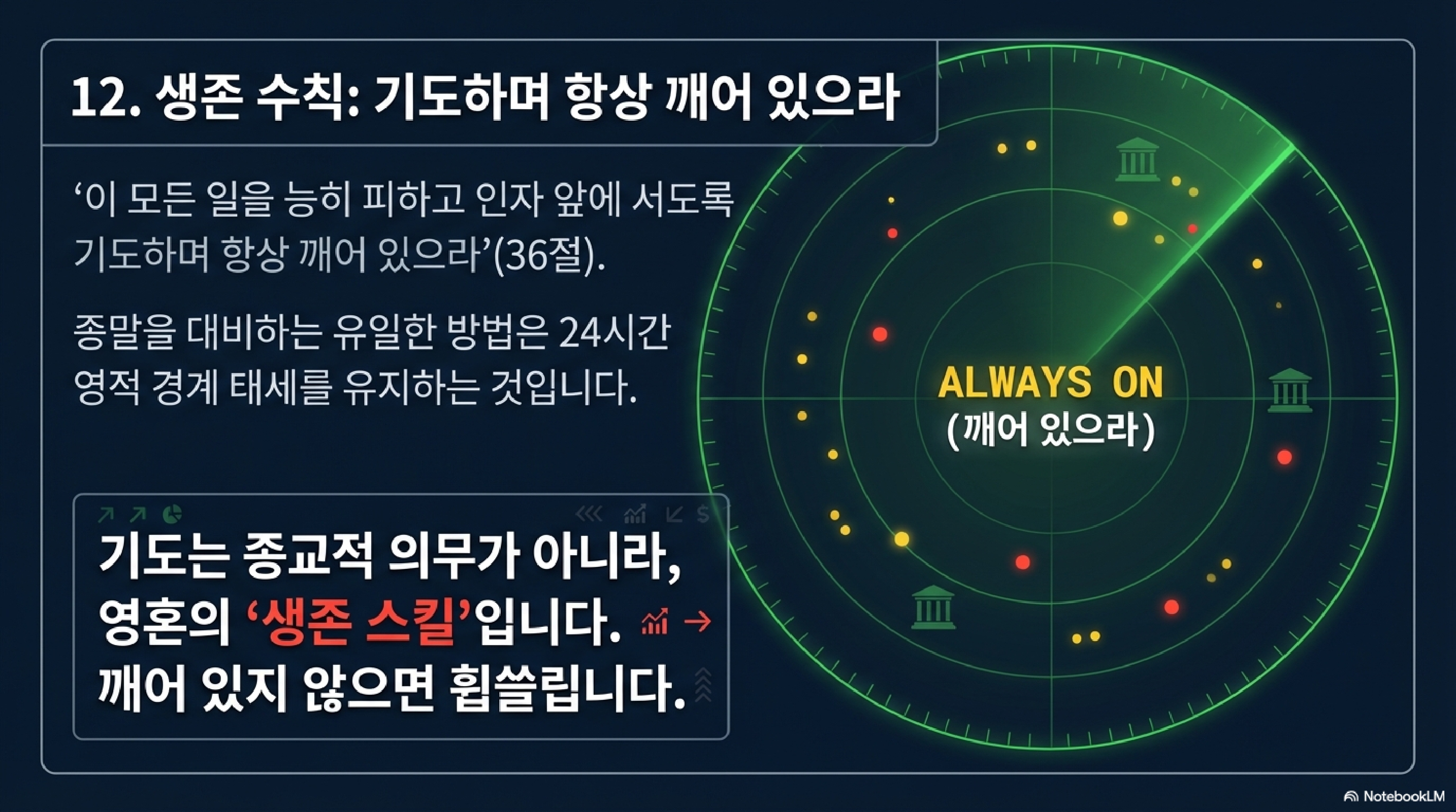 마지막으로 예수님은 아주 실질적인 리스크 관리법을 제시하십니다. 34절에 나오는 방탕함, 술 취함, 그리고 생활의 염려입니다. 이건 현대인의 3대 질병인 중독, 쾌락, 그리고 만성 불안이라는 시스템 노이즈입니다. 이런 영적 노이즈에 매몰되어 시그널을 놓치면, 그날은 덫과 같이 여러분을 덮칠 것입니다.